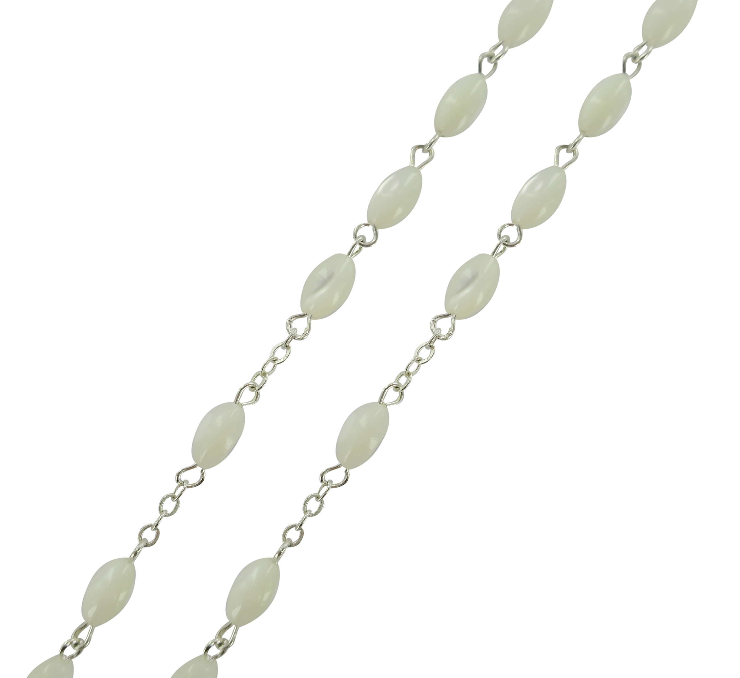 Il rosario in vera madreperla ovale, è legato a mano con filo di metallo argentato, croce con Cristo riportato e crociera ovale con Madonnina pregante.La croce con Cristo misura cm 4 la crociera con Volto di Maria misura cm 1,5La lunghezza del rosario è di cm 50 e la circonferenza è di cm 70.Peso: 23 gr.Materiale: madreperlaTutto completamente made in Italy.