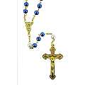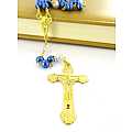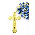 Rosario con grani tondi imitazione perla blu e pater bianchi di mm 6.La legatura del rosario è in metallo dorato.La croce misura cm 4 e la crocera raffigura la madonna con il bambino.La lunghezza del rosario misura cm 45 e la circonferenza è di cm 62.Peso: gr.25