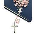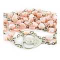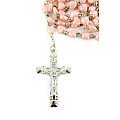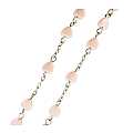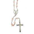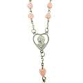 Rosario in plastica con grani a forma di cuore di colore rosa e legatura in metallo argentato