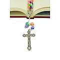 Questo rosario molto allegro è legato a mano con filo in metallo nichelato e grani in plastica a forma di fiore con petali stampati.La crocera in metallo nichelato rappresenta la Vergine Maria e la croce anch'essa in metallo nichelato misura cm 4,5.La lunghezza del rosario è di cm.54Il peso del rosario è gr.22,5