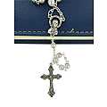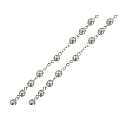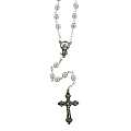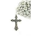 Rosario con grani tondi imitazione perla di colore azzurro con coppiglie.I grani del rosario sono di mm 5.La legatura del rosario è realizzata in metallo argentato cosi come la crocera e la croce.