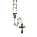 Rosario con grani tondi imitazione perla di colore bianco con coppiglie.I grani del rosario sono di mm 5.La legatura del rosario è realizzata in metallo argentato cosi come la crocera e la croce.