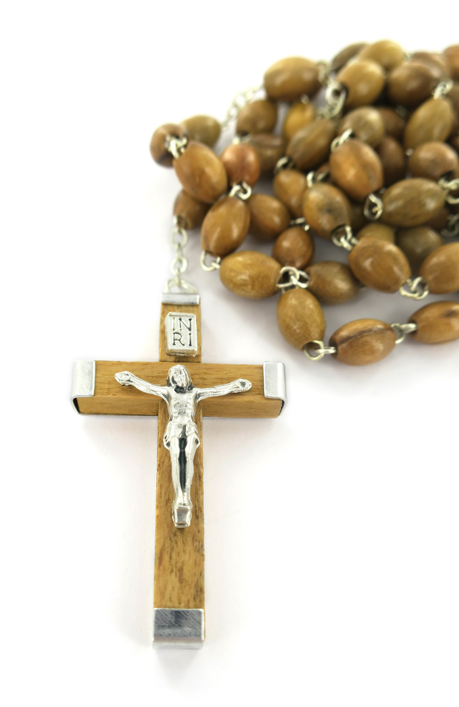 Il rosario si presenta con grani in ulivo ovale con diametro mm 6, legati a mano con metallo argentato. La crociera rappresenta il Volto di Maria e la croce in legno con Cristo riportato e fondo in metallo.La croce con Cristo misura cm 4,5 la crociera con Volto di Maria misura cm 1,5La lunghezza del rosario è di cm 50 la circonferenza è di cm 68.Peso: 14 gr.Materiale: ulivoTutto completamente made in Italy.