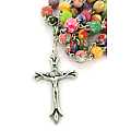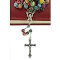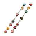 La particolarità di questo rosario è rappresentata dai grani tondi,di mm 8, in vetro satinato ognuno con colori e fantasie diverse.Il rosario,rilegato in metallo argentato,risulta essere molto originale e piacevole.La crocera rappresenta la Vergine Maria e la croce misura cm 4,5.La lunghezza del rosario è di cm.53Il peso del rosario è di gr.34