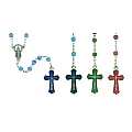 Rosario imitazione pietra dura di colori assortiti, ametista, verde, azzurro e blu con croce smaltata del colore del grano, la crociera traforata rappresenta la Madonna Miracolosa.Sono venduti in confezione da 12 pezzi 3 per colore e si presentano ciascuno in scatolina con coperchio trasparente.Misura totale compresa di croce circa cm 40 il grano misura 5 mmTutto made in Italy.
