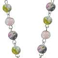 Rosario con grani tondi in vetro con effetto marmorizzato il cui diametro è di 6 mm.La legatura,la croce e la crocera sono in metallo argentato