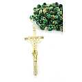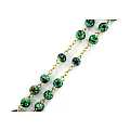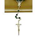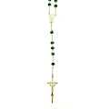Rosario con grani tondi in vetro di colore verde il cui diametro è di 6 mm.La legatura,la croce e la crocera sono in metallo argentato