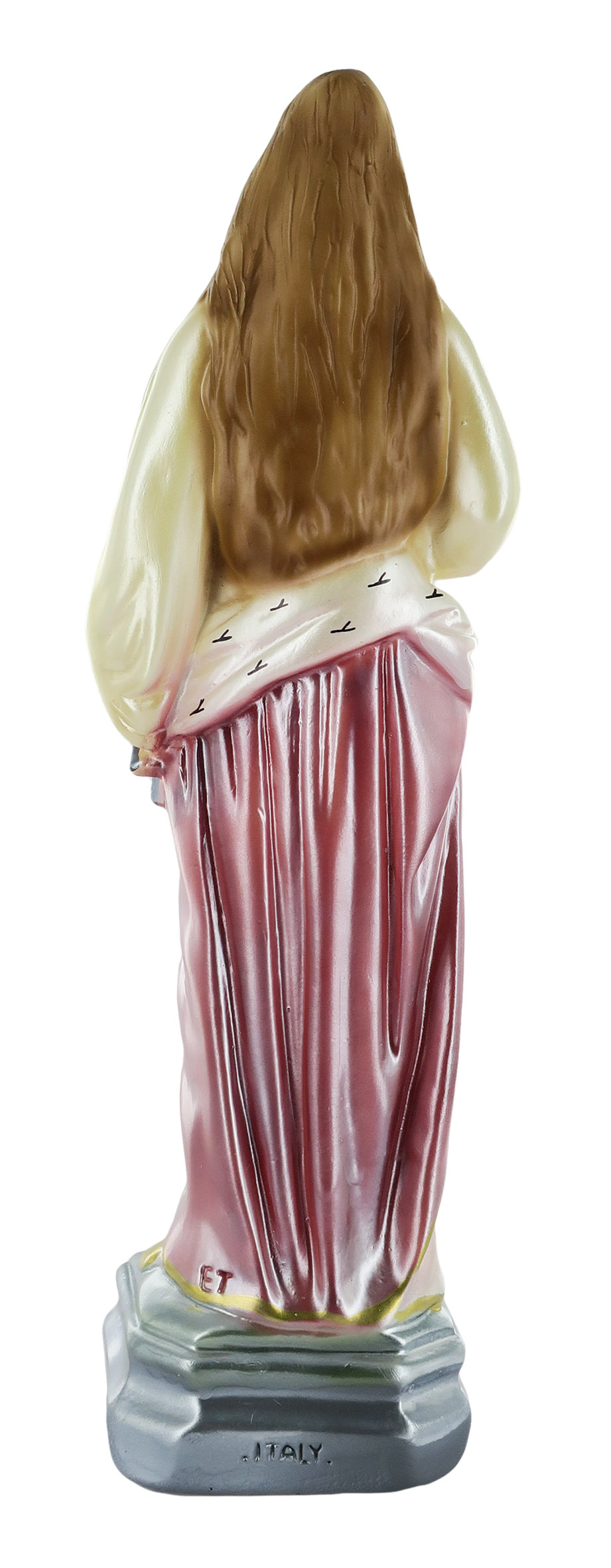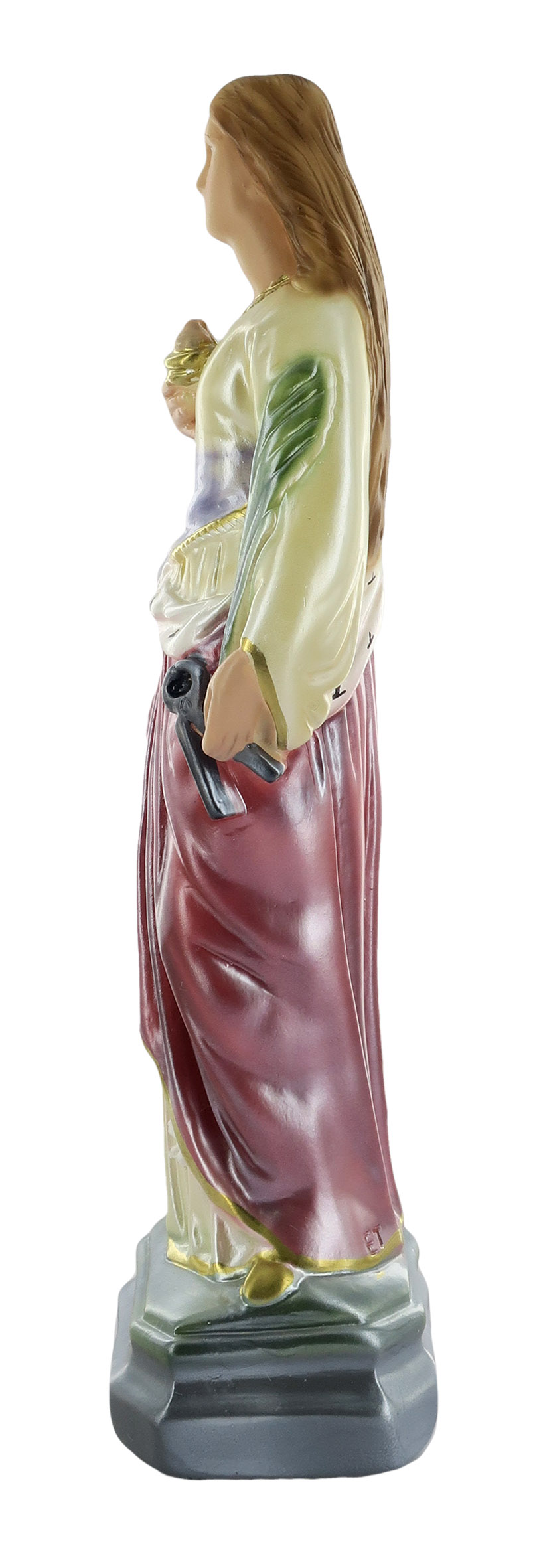 La statua, in gesso finemente dipinto a mano e impreziosita da una rifinitura madreperlata, raffigura Sant'Agata, vergine e martire, con una tunica bianca coperta da un mantello rosa. Viene qui raffigurata con due dei suoi simboli: una coppia di seni tagliati in una coppa e una pinza. La storia vuole che la donna, perseguitata dal proconsole Quinziano, sia stata catturata, fustigata e poi sottoposta a torture, che hanno previsto anche l'asportazione dei seni con delle tenaglie. La santa è patrona delle donne affette da patologie al seno, balie, nutrici, nonché di Gallipoli, Catania e San Marino. Questa statua di Sant'Agata da 30 cm è realizzata artigianalmente in Italia e si distingue per la qualità della fattura e per il sapiente uso dei colori. L'effetto madreperlato rende le tinte molto lucenti e arricchisce la figura di suggestivi riflessi, donandole un aspetto elegante e raffinato. Può essere esposta in piccole nicchie di luoghi di culto, ma è ideale per vetrinette in casa o come soprammobile. La statua di Sant'Agata sarà, inoltre, una gradita idea regalo per i devoti a questo personaggio, celebrato il 5 febbraio. La luce delle fiammelle dei lumini o dei faretti esalterà l'effetto iridescente della sua rifinitura madreperlacea. A causa della pittura a mano, la colorazione potrebbe variare: idealmente, ogni statua è un pezzo unico. Peso: 665 gr (691 gr con scatola). Dimensioni: 8 cm (L), 30 cm (A), 6 cm (P). Imballo: 13 cm (L), 33 cm (A), 12 cm (P).