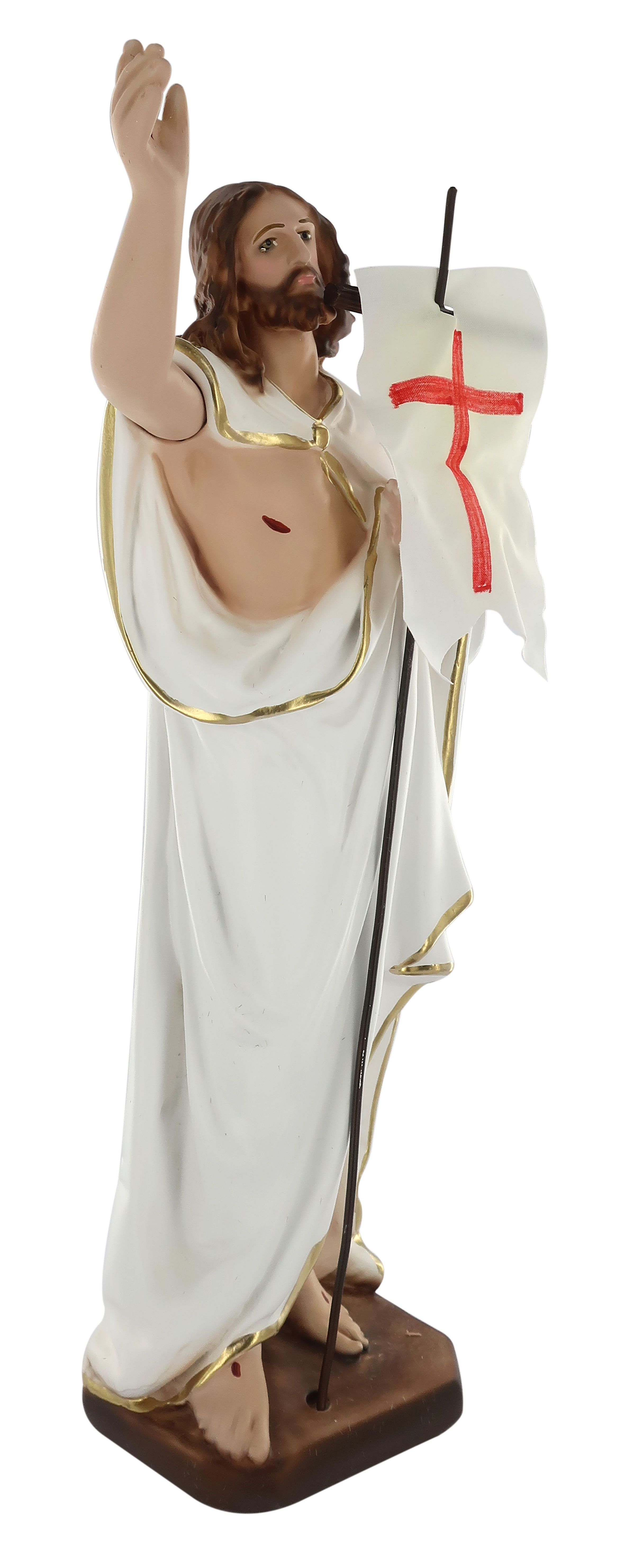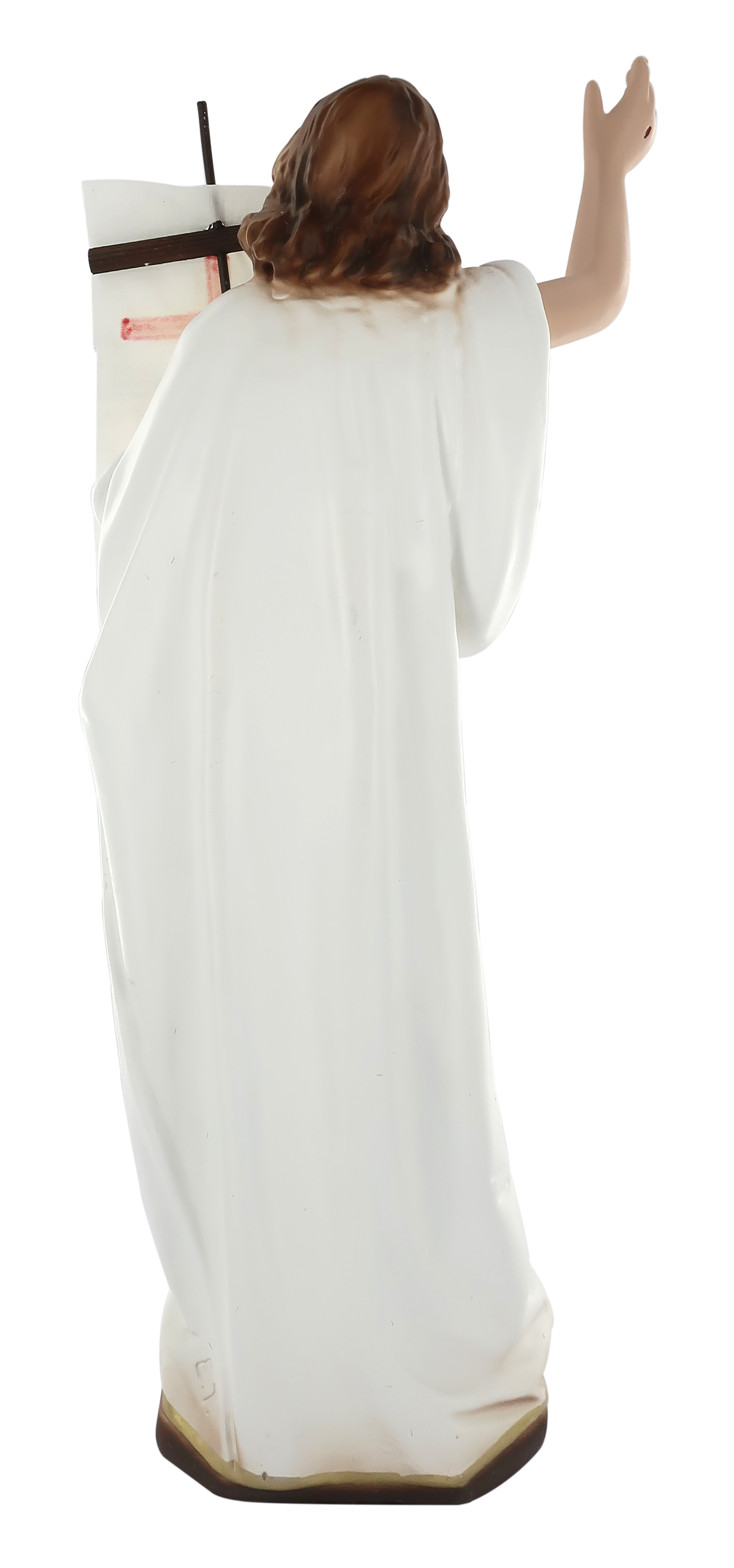 La statua, in gesso finemente dipinto a mano, è dedicata a Gesù Cristo Risorto. Su un piedistallo marrone, come vuole l'iconografia, il Salvatore veste una tunica bianchissima, porta i segni della crocifissione alle mani e ai piedi, ha una mano rivolta verso l'alto e regge nell'altra il caratteristico vessillo crociato in segno di vittoria contro la morte. Questa statua di Gesù Risorto da 40 cm è realizzata artigianalmente in Italia e si distingue per la qualità della fattura e per il sapiente uso dei colori. Le linee delle vesti e dei tratti del volto, nonché la resa delle loro pieghe, donano plasticità alla figura e la rendono suggestiva. Particolarmente adatta a nicchie e luoghi di culto, la statua di Cristo Risorto sarà ancora più bella se illuminata dalla luce delle fiammelle dei lumini o dei faretti, che esalterà la fisicità e l'impatto visivo del soggetto. A causa della pittura a mano, la colorazione potrebbe variare: idealmente, ogni statua è un pezzo unico. Dimensioni: 17 cm (L), 40 cm (A), 10,5 cm (P). Peso: 2,469 kg.
