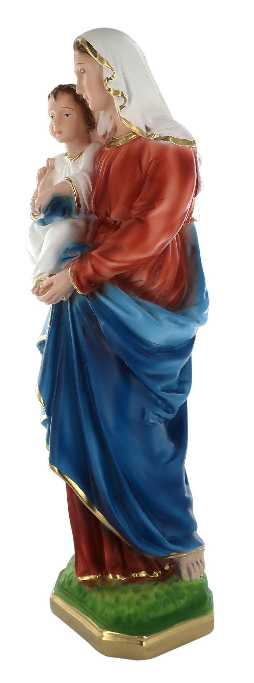 La statua, in gesso finemente dipinto a mano, raffigura la Madonna con Bambino, una delle rappresentazioni più classiche e diffuse della Cristianità. Maria è su un piedistallo color oro, con Gesù Bambino in braccio. La donna veste una tunica rosso/arancione coperta da un mantello azzurro con orli color oro. Al contrasto tra questi colori si aggiunge la veste immacolata del Bambino, che risalta in questa tenera rappresentazione. Questa statua della Madonna con il Bambino da 40 cm è realizzata artigianalmente in Italia e si distingue per la qualità della fattura e per il sapiente uso dei colori. Le tonalità cromatiche usate, molto coprenti e a tratti sfumate, donano plasticità alla figura e gli indumenti vantano un'attenzione particolare alla resa delle pieghe. La statua della Madonna con Gesù Bambino è ideale per piccole nicchie e luoghi di culto. La luce delle fiammelle dei lumini o dei faretti esalterà la fisicità del soggetto, aumentandone l'impatto visivo. A causa della pittura a mano, la colorazione potrebbe variare: idealmente, ogni statua è un pezzo unico. Peso: 2,82 kg (2,95 kg con scatola). Dimensioni: 14 cm (L), 40 cm (A), 9,5 cm (P). Confezione: 20 cm (L), 46 cm (A), 14,5 cm (P).