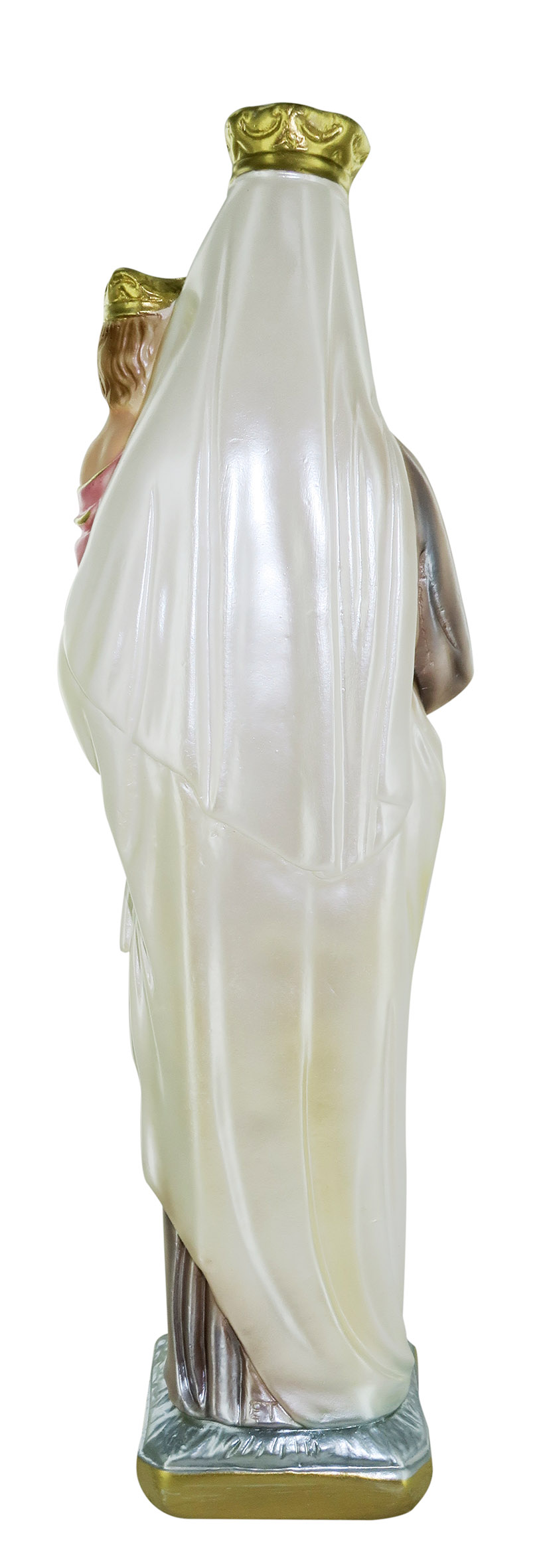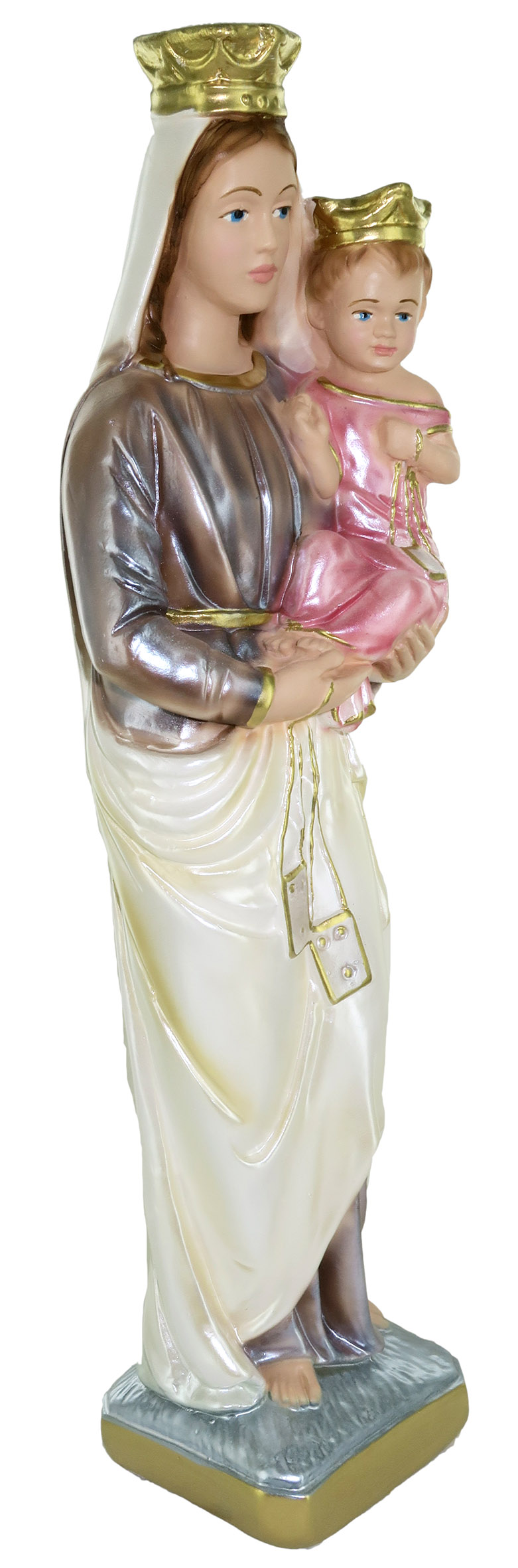 La statua, in gesso finemente dipinto a mano e impreziosito da una rifinitura madreperlata, raffigura la Madonna del Monte Carmelo, una delle rappresentazioni della Vergine più sentite, oggetto di devozione anche da parte di san Giovanni Paolo II. La Madonna è qui rappresentata su un piedistallo color oro, con il Bambino in braccio. Entrambi i soggetti hanno in mano lo scapolare, elemento identificativo di questa figura. L'impatto visivo della statua è assicurato anche dal contrasto cromatico tra i due colori degli indumenti: il lungo velo immacolato spicca sul colore scuro della veste. Dedicata alla patrona dei carmelitani e alla protettrice di chi indossa lo scapolare, questa statua della Madonna del Carmine da 30 cm è realizzata artigianalmente in Italia e si distingue per la qualità della fattura e per il sapiente uso dei colori. L'effetto madreperlato rende le tinte molto lucenti e arricchisce la figura di suggestivi riflessi, donandole un aspetto elegante e raffinato. La statua della Nostra Signora del Carmine è ideale per piccole nicchie e luoghi di culto, ma può anche essere esposta in casa come soprammobile o in una vetrinetta per celebrare colei che è considerata sostegno delle anime del Purgatorio. La sua memoria liturgica è fissata al 16 luglio. La luce delle fiammelle dei lumini o dei faretti esalterà l'effetto iridescente della sua rifinitura madreperlacea. A causa della pittura a mano, la colorazione potrebbe variare: idealmente, ogni statua è un pezzo unico.