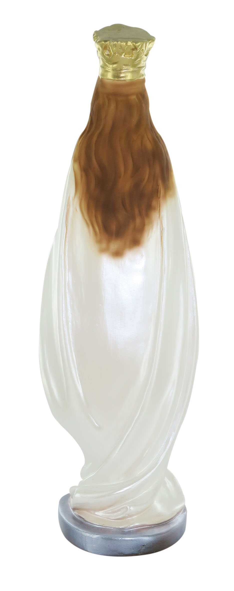 La statua, in gesso finemente dipinto a mano e impreziosito da una rifinitura madreperlata, raffigura la Madonna di Knock e celebra l'apparizione mariana avvenuta nell'agosto del 1879 nella località di Knock, in Irlanda, diventata la meta di pellegrinaggio cattolico principale dell'isola. Indossa una veste bianchissima molto semplice e ricca di pieghe, impreziosita da dettagli in color oro e una corona. Secondo il racconto della testimone, Mary McLoughlin, la Madonna apparve insieme a S. Giuseppe e a S. Giovanni. Questa statua della Beata Vergine Maria di Knock da 30 cm d'altezza è realizzata artigianalmente in Italia e si distingue per la qualità della fattura e per il sapiente uso dei colori. L'effetto madreperlato rende le tinte molto lucenti e arricchisce la figura di suggestivi riflessi, donandole un aspetto elegante e raffinato. Adatta a nicchie di luoghi di culto, la statua della Madonna di Knock è ideale per vetrinette di casa o come soprammobile. Sarà, inoltre, una gradita idea regalo per i devoti mariani. La luce delle fiammelle dei lumini o dei faretti esalterà l'effetto iridescente della sua rifinitura madreperlacea, rendendo la figura ancora più bella. A causa della pittura a mano, la colorazione potrebbe variare: idealmente, ogni statua è un pezzo unico. Peso: 705 gr. Dimensioni: 10 cm (L), 30 cm (A), 9 cm (P).