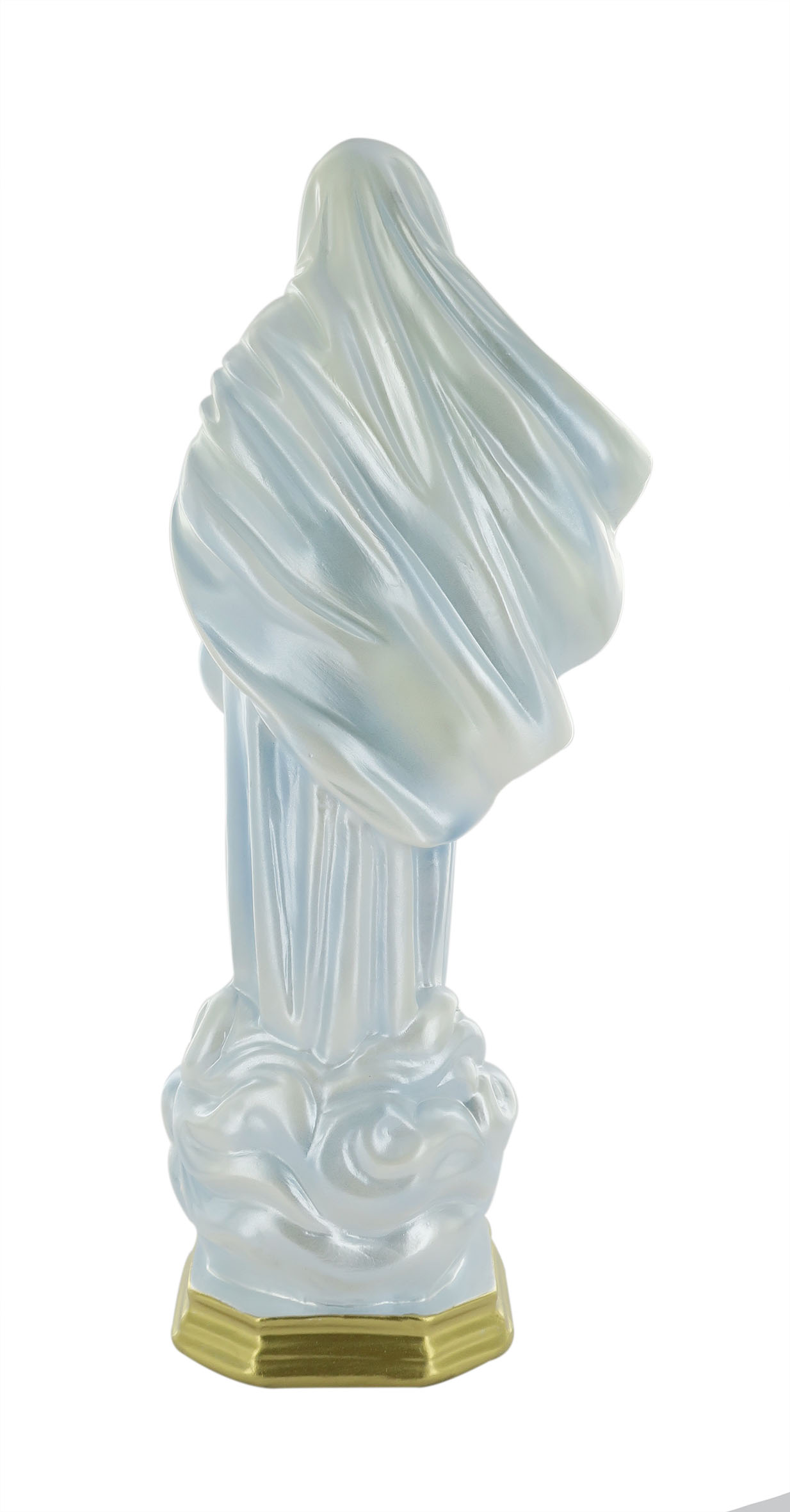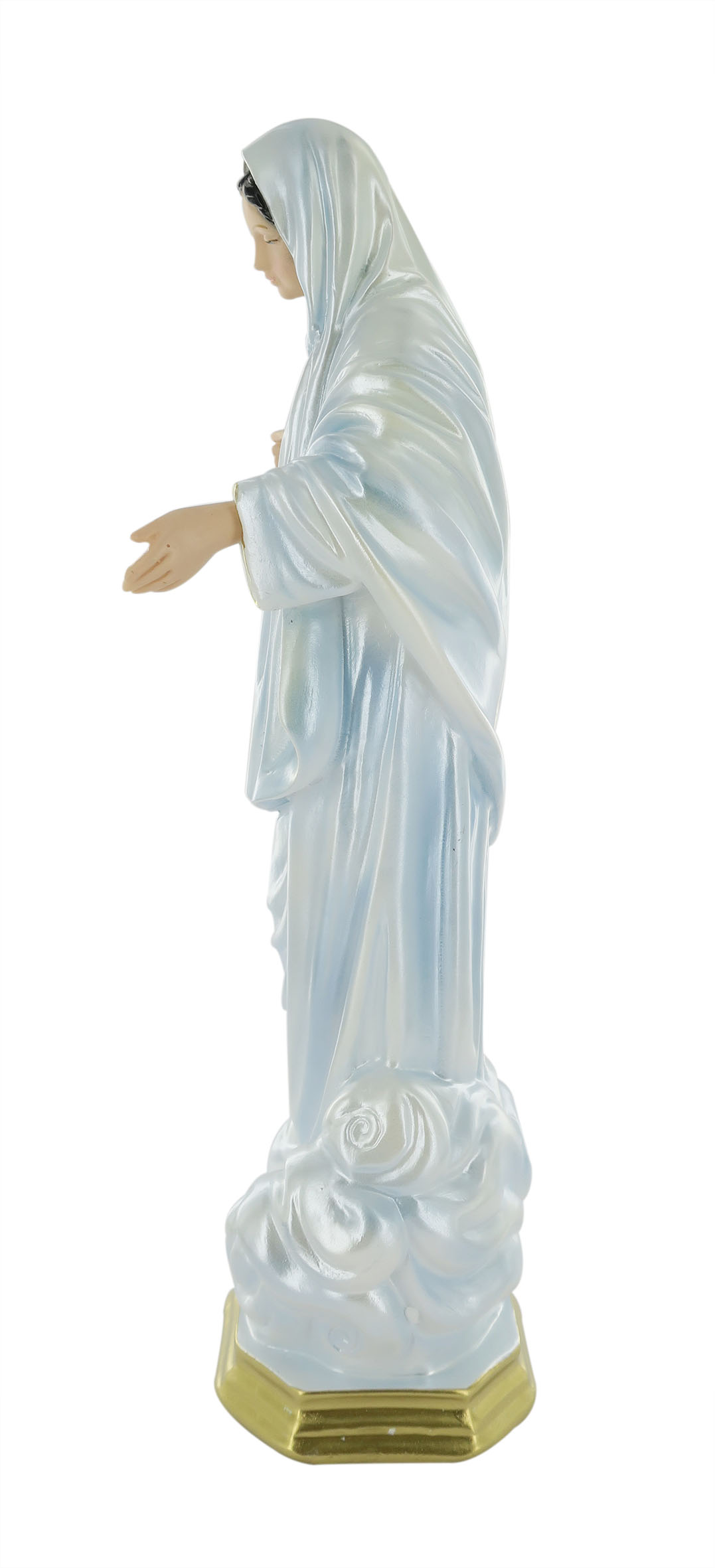 La statua, in gesso finemente dipinto a mano e impreziosito da una rifinitura madreperlata, è dedicata alla Madonna di Medjugorje, raffigurazione della Vergine che apparve nei pressi della collina del Podbrdo, in Bosnia-Erzegovina, per la prima volta nel 1981. La statua ritrae la Santa Madre in abiti azzurri ricchi di pieghe, in piedi su una nuvola. Questa statua della Madonna di Međugorje di 33 cm d'altezza è realizzata artigianalmente in Italia e si distingue per la qualità della fattura e per il sapiente uso dei colori. L'effetto madreperlato rende le tinte molto lucenti e arricchisce la figura di suggestivi riflessi, donandole un aspetto elegante e raffinato. La statua della Madonna di Medjugorje può essere esposta in nicchie di luoghi di culto, in vetrinette di casa o come soprammobile. Sarà, inoltre, una gradita idea regalo per i devoti mariani. La luce delle fiammelle dei lumini o dei faretti esalterà l'effetto iridescente della sua rifinitura madreperlacea, rendendo la figura ancora più bella. A causa della pittura a mano, la colorazione potrebbe variare: idealmente, ogni statua è un pezzo unico. Peso: 1,069 kg. Dimensioni: 14 cm (L), 33 cm (A), 8 cm (P).