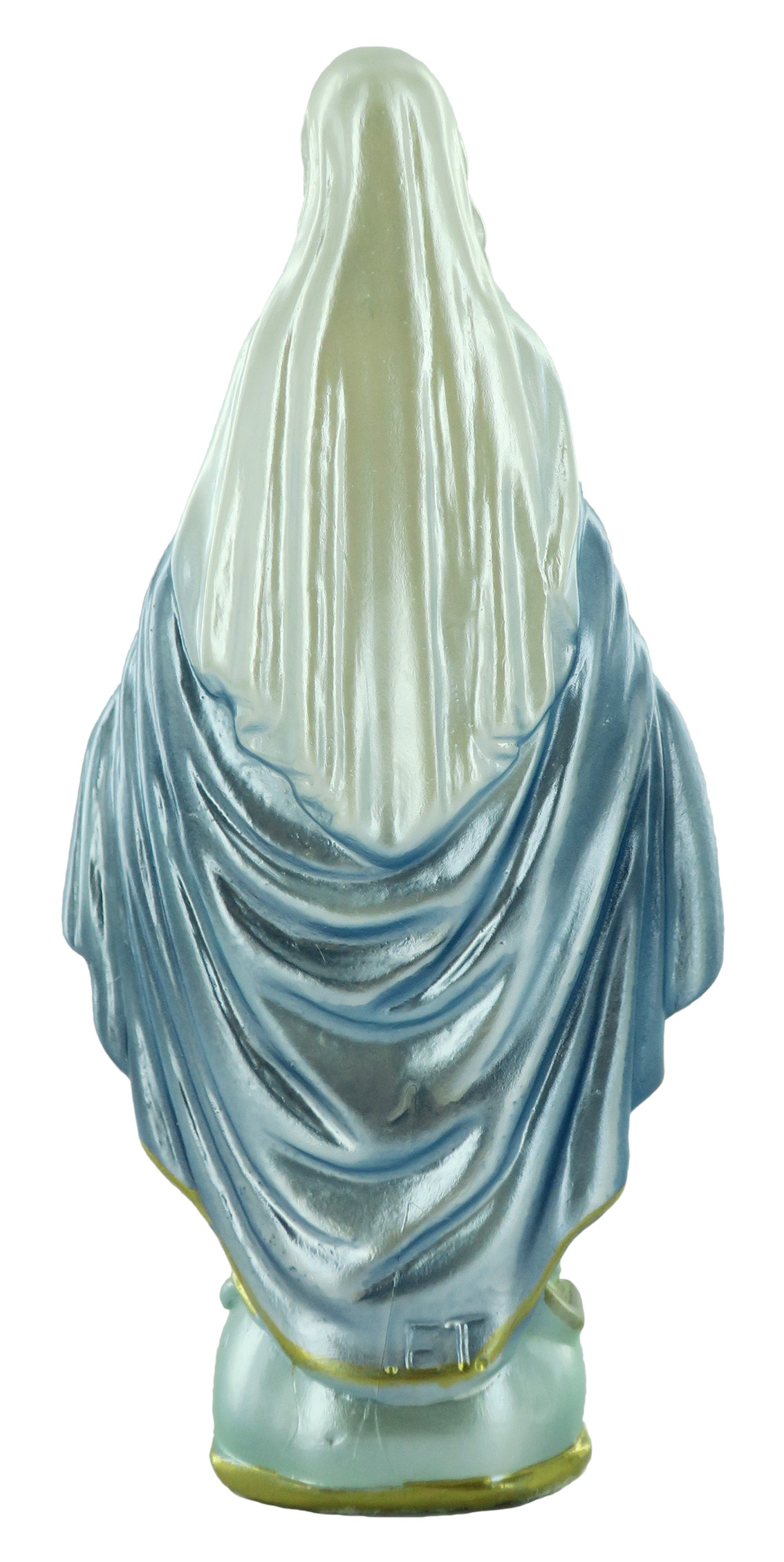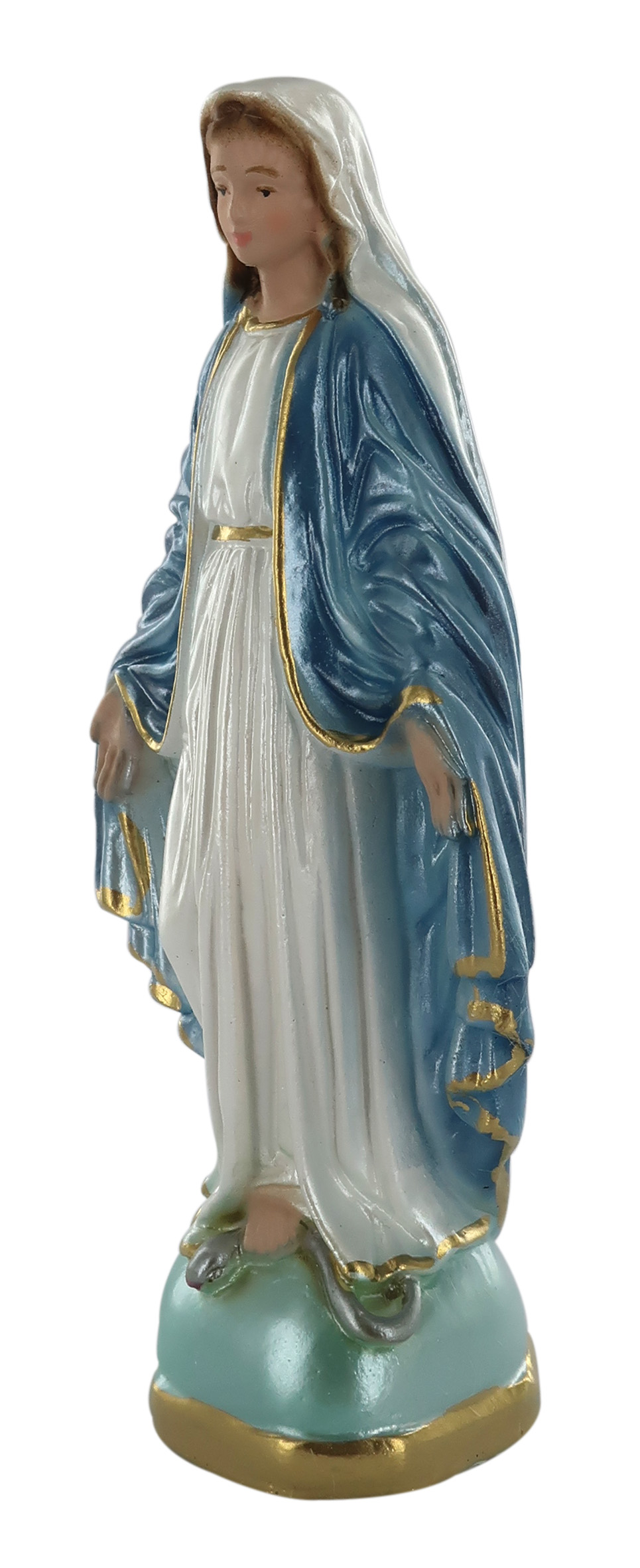 La statua, in gesso finemente dipinto a mano impreziosito da una rifinitura madreperlata, raffigura la Madonna Miracolosa scalza sopra a un piedistallo color verde acqua, col volto e le mani aperte verso i fedeli. Con espressione beata, la santa indossa una veste bianca coperta da un mantello azzurro bordato di color oro. Gli indumenti vantano un'attenzione particolare alla resa delle pieghe e delle delicate sfumature, che donano grande plasticità alla rappresentazione. Questa statua della Madonna Miracolosa da 15 cm è stata realizzata artigianalmente in Italia e si distingue per la qualità della fattura e per il sapiente uso dei colori. L'effetto madreperlato rende le tinte molto lucenti e arricchisce la figura di suggestivi riflessi, donandole un aspetto elegante e raffinato. La statua della Madonna Miracolosa è ideale per nicchie o ambienti dedicati al culto, ma può anche essere esposta in casa come soprammobile o in una vetrinetta. La luce delle fiammelle dei lumini o dei faretti esalterà l'effetto iridescente della sua rifinitura madreperlacea. A causa della pittura a mano, la colorazione potrebbe variare: idealmente, ogni statua è un pezzo unico.