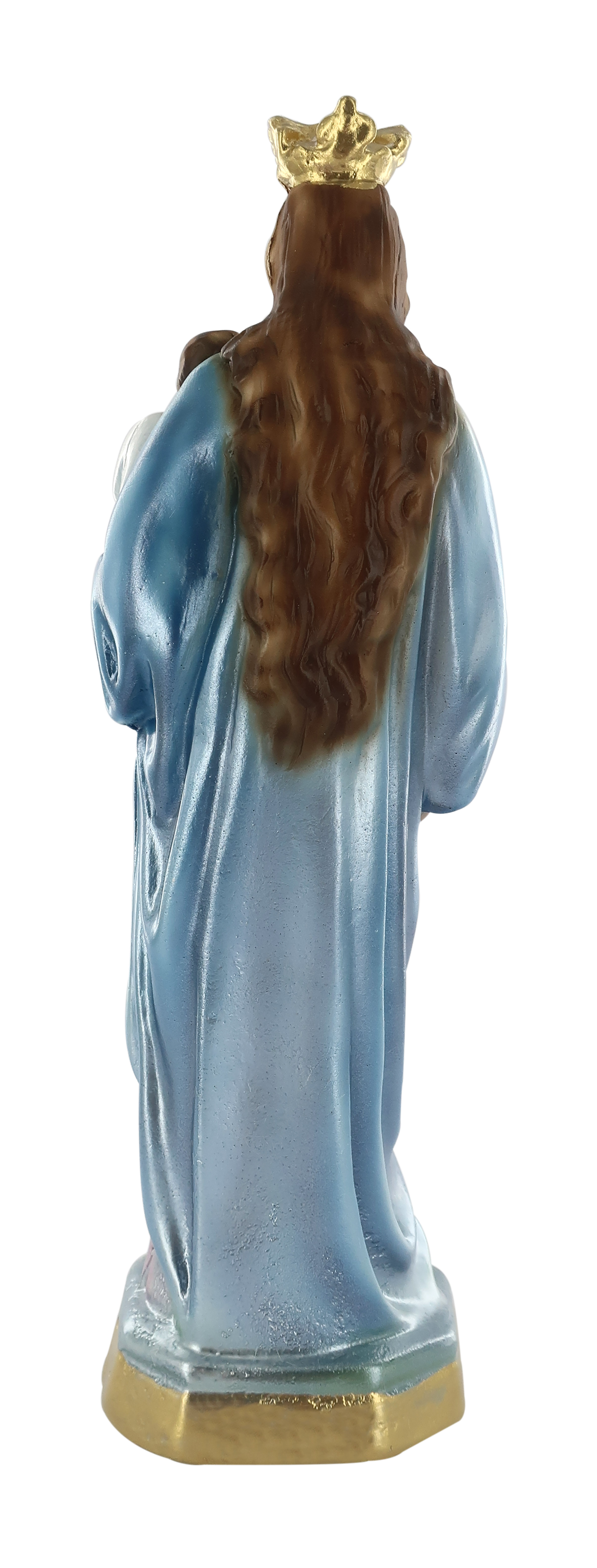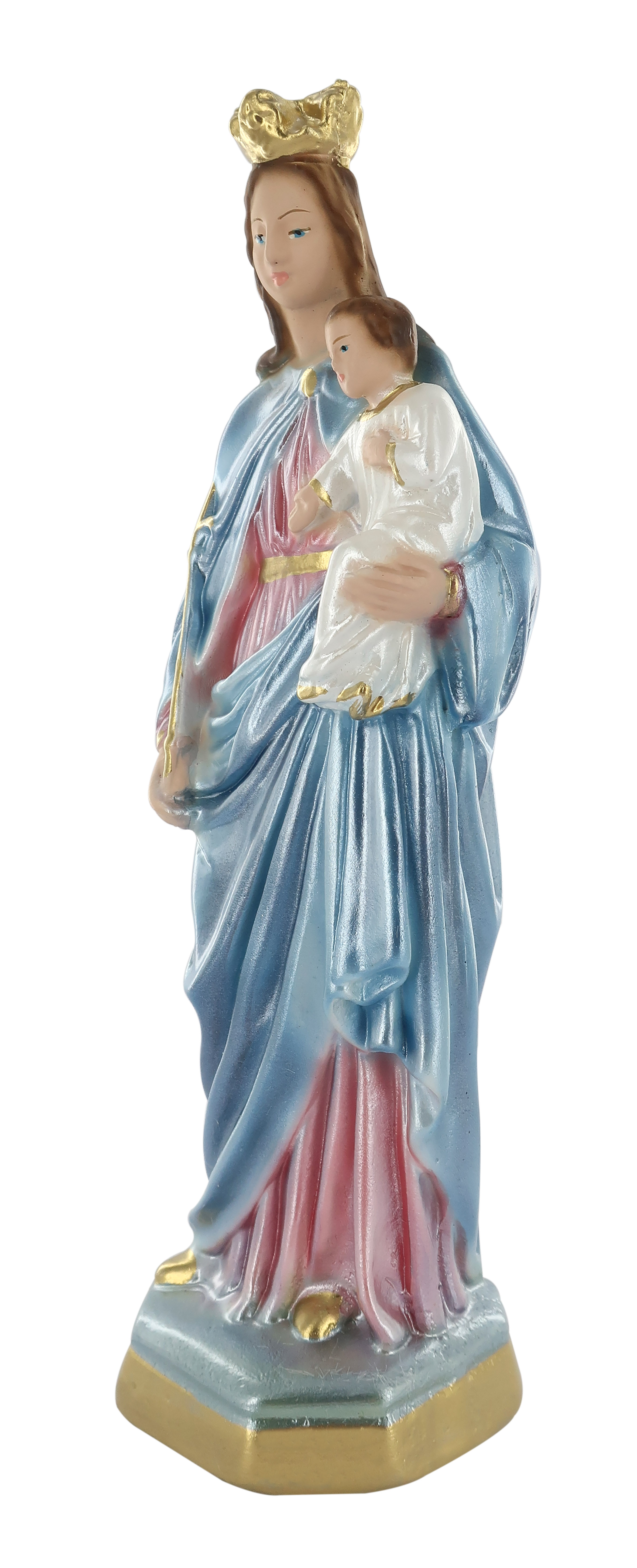 La statua, in gesso dipinto a mano, raffigura Maria Ausiliatrice, titolo attribuito alla santa vergine per la prima volta dalle Litanie Lauretane nel XVI secolo. La diffusione del culto di Maria Ausiliatrice la si deve a Giovanni Bosco, che la elesse patrona della famiglia salesiana. È considerata anche patrona della Polonia, Argentina, Slovenia, Australia e Cina. Questa statua di Maria Aiuto dei Cristiani da circa 20 cm è realizzata artigianalmente in Italia e si distingue per la qualità della fattura e per il sapiente uso dei colori. Le linee delle vesti e la resa delle loro pieghe donano plasticità alla figura e la rendono suggestiva. Adatta anche a piccole nicchie in luoghi di culto, la statuetta della Madonna Ausiliatrice risulta anche indicata per essere esposta a casa come soprammobile o in una vetrinetta. Per i devoti mariani, può essere anche una gradita idea regalo. La luce delle fiammelle dei lumini o dei faretti esalterà la fisicità del soggetto e ne aumenterà l'impatto visivo. A causa della pittura a mano, la colorazione potrebbe variare: idealmente, ogni statua è un pezzo unico. Dimensioni: 7 cm (L), 23 cm (A), 6,2 cm (P). Peso: 382 gr.