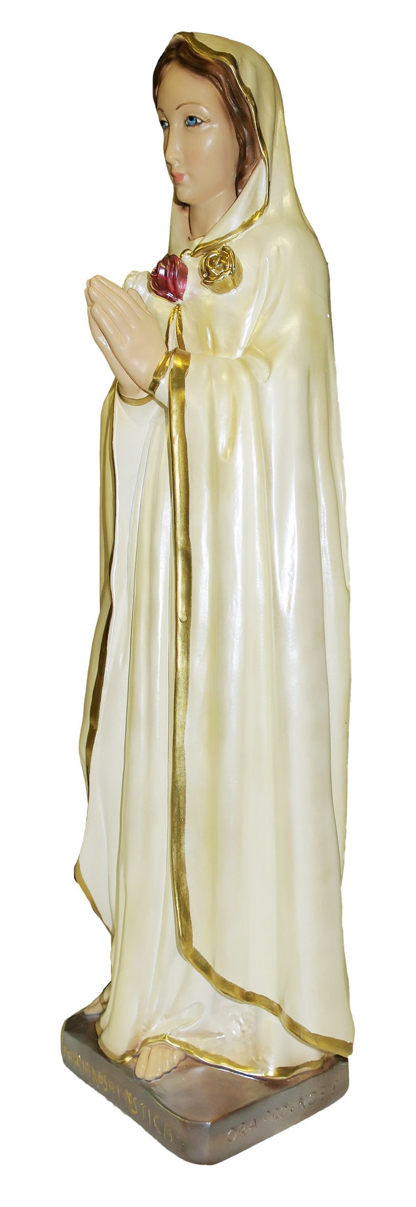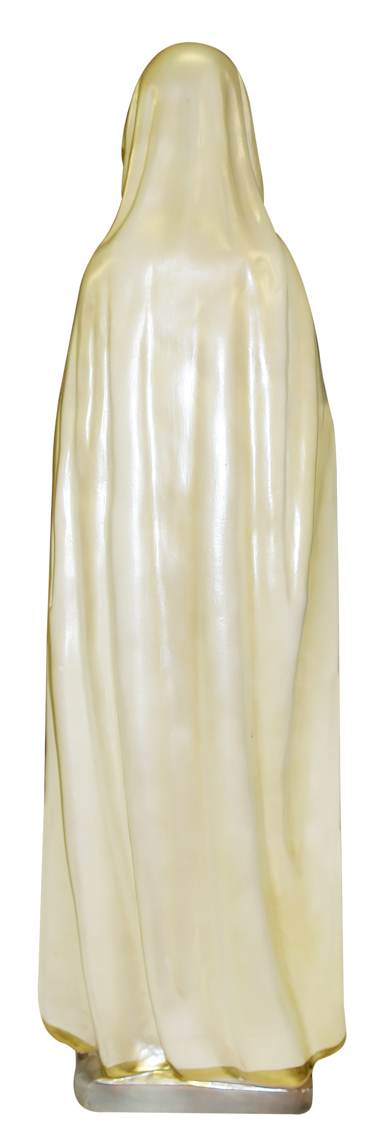 La statua, in gesso finemente dipinto a mano e impreziosito da una rifinitura madreperlata, raffigura la Madonna in una delle sue rappresentazioni: Rosa Mistica. Ritratta scalza su un piedistallo color argento che reca il suo nome, la Vergine indossa una veste color panna con copricapo del medesimo delicato colore, con bordi in color oro e abbellita da tre rose, volte a rappresentare la preghiera (bianca), il sacrificio (rossa) e la penitenza (gialla). Gli indumenti vantano un'attenzione particolare alla resa delle pieghe e delle delicate sfumature, che donano grande plasticità e profondità alla rappresentazione. Questa statua della Rosa Mistica da 40 cm è realizzata artigianalmente in Italia e si distingue per la qualità della fattura e per il sapiente uso dei colori, adeguatamente dosati. L'effetto madreperlato rende le tinte molto lucenti e arricchisce la figura di suggestivi riflessi, donandole un aspetto elegante e pregevole. La statua della Rosa Mistica è particolarmente adatta a nicchie in luoghi dedicati al culto; la luce di faretti o delle fiammelle di lumini e candele esalterà l'effetto iridescente della sua rifinitura madreperlacea. A causa della pittura a mano, la colorazione potrebbe variare: idealmente, ogni statua è un pezzo unico.