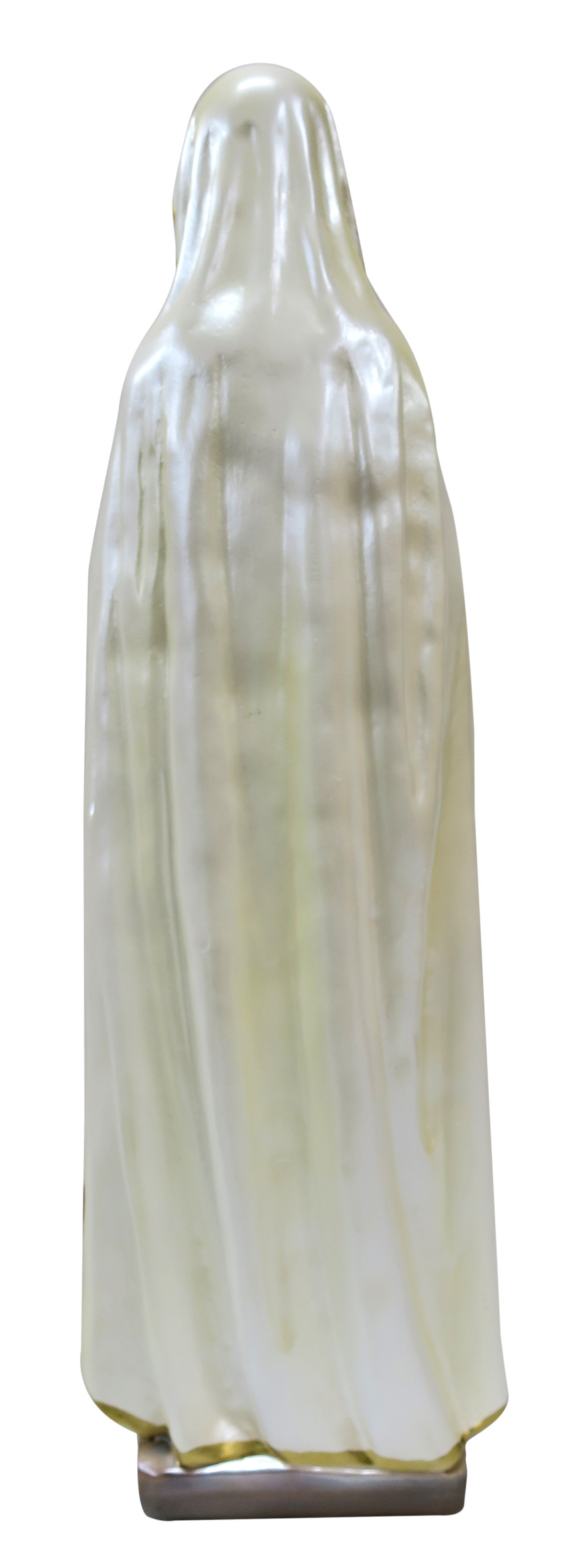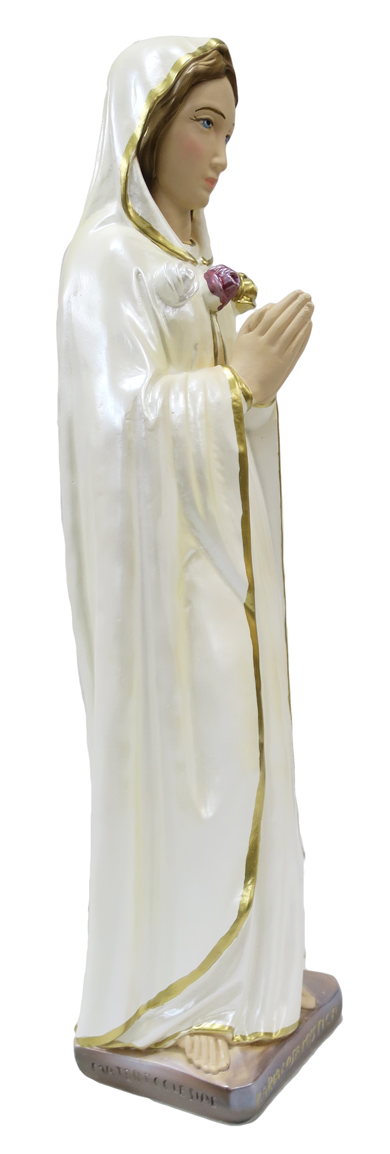 La statua, in gesso finemente dipinto a mano e impreziosito da una rifinitura madreperlata, raffigura la Madonna in una delle sue rappresentazioni: Rosa Mistica. Ritratta scalza su un piedistallo color argento che reca il suo nome, la Vergine indossa una veste bianca con copricapo del medesimo delicato colore, con bordi in color oro e abbellita da tre rose, volte a rappresentare la preghiera (bianca), il sacrificio (rossa) e la penitenza (gialla). Gli indumenti vantano un'attenzione particolare alla resa delle pieghe e delle delicate sfumature, che donano grande plasticità e profondità alla rappresentazione. Questa statua della Rosa Mistica da 50 cm è realizzata artigianalmente in Italia e si distingue per la qualità della fattura e per il sapiente uso dei colori, adeguatamente dosati. L'effetto madreperlato rende le tinte molto lucenti e arricchisce la figura di suggestivi riflessi, donandole un aspetto elegante e pregevole. La statua della Rosa Mistica è particolarmente adatta a nicchie in luoghi dedicati al culto e a edicole; la luce di faretti esalterà l'effetto iridescente della sua rifinitura madreperlacea. A causa della pittura a mano, la colorazione potrebbe variare: idealmente, ogni statua è un pezzo unico. Peso: 3,9 kg (4 kg con scatola). Dimensioni: 14,5 cm (L), 50 cm (A), 12,5 cm (P). Imballo: 20 cm (L), 15 cm (A), 53 cm (P).