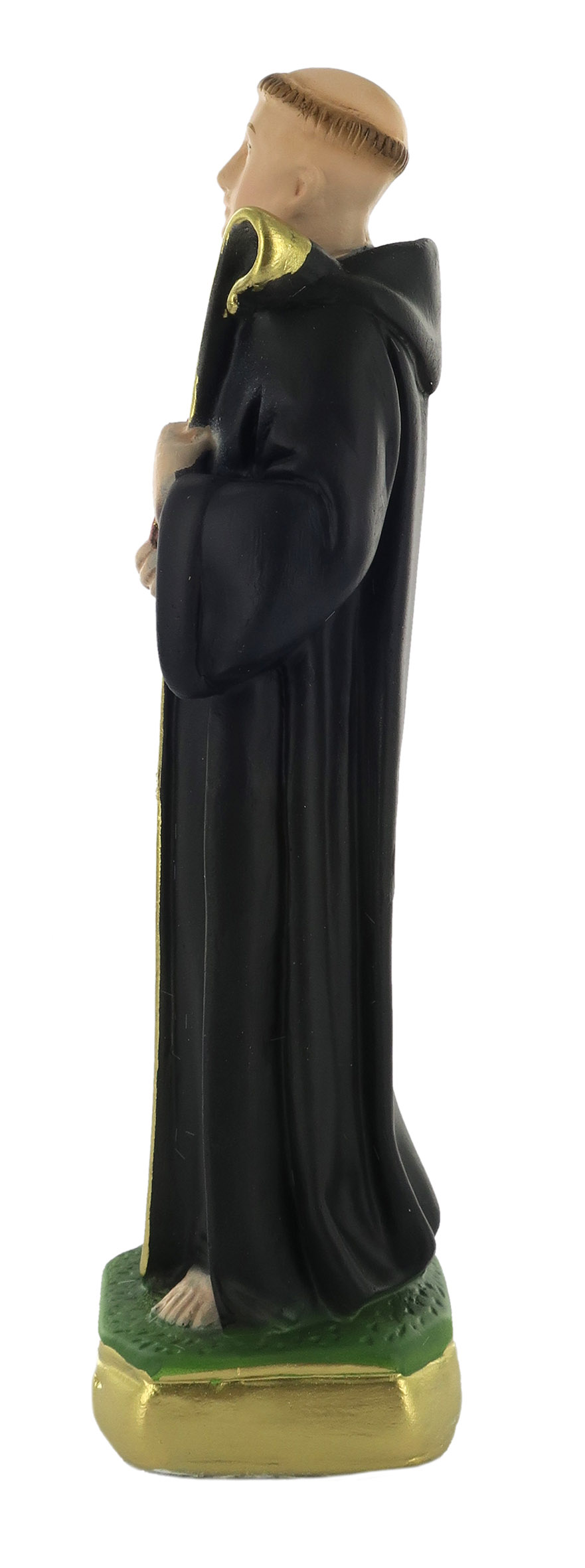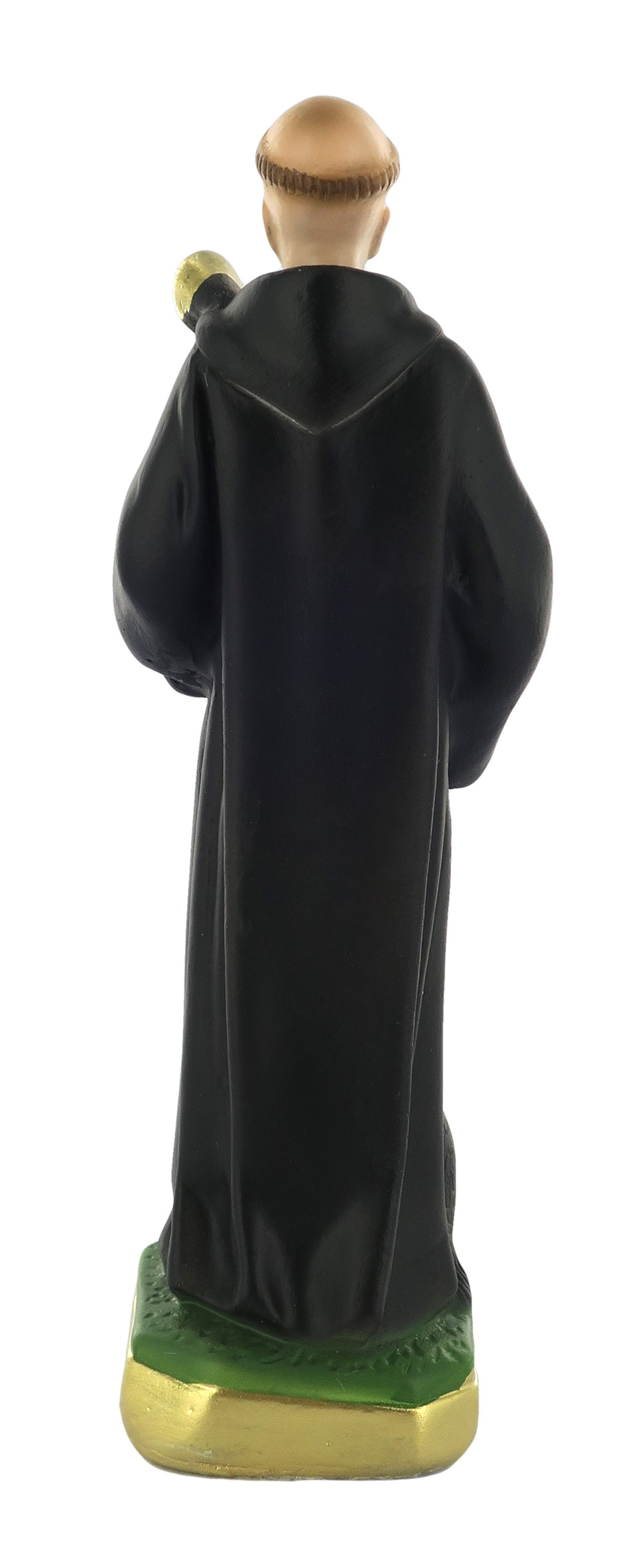 La statua, in gesso finemente dipinto a mano, raffigura San Benedetto da Norcia su un piedistallo color oro e verde. Insieme al santo trova posto nella rappresentazione il suo animale simbolo, il corvo. La vicenda narra che il sacerdote Fiorenzo, invidioso dei successi dell'uomo, abbia tentato di assassinarlo inviandogli del pane avvelenato. S. Benedetto, accortosene, avrebbe ordinato all'animale di sbarazzarsene per non recare male a nessuno. L'uomo è qui rappresentato con un pastorale color oro (anch'esso suo simbolo) e un libro rosso (il suo scritto, la "Regola benedettina"), che spiccano sulla sua veste scura, molto semplice e lineare. Questa statua di S. Benedetto di circa 15 cm d'altezza è realizzata artigianalmente in Italia e si distingue per la qualità della fattura e per il sapiente uso dei colori. Le tonalità cromatiche, a volte molto coprenti, altre invece opportunamente sfumate, donano plasticità e realismo alla figura. Adatta a piccole nicchie, la statuetta di San Benedetto da Norcia può anche essere esposta in casa come soprammobile o in una vetrinetta. Sarà particolarmente apprezzata come idea regalo dai devoti a questo personaggio. La luce delle fiammelle dei lumini o dei faretti esalterà la fisicità del soggetto, aumentandone l'impatto visivo. A causa della pittura a mano, la colorazione potrebbe variare: idealmente, ogni statua è un pezzo unico. Peso: 172 gr (189 gr con scatola). Dimensioni: 5,5 cm (L), 17 cm (A), 4,5 cm (P). Imballaggio: 12 cm (L), 20 cm (A), 9 cm (P).