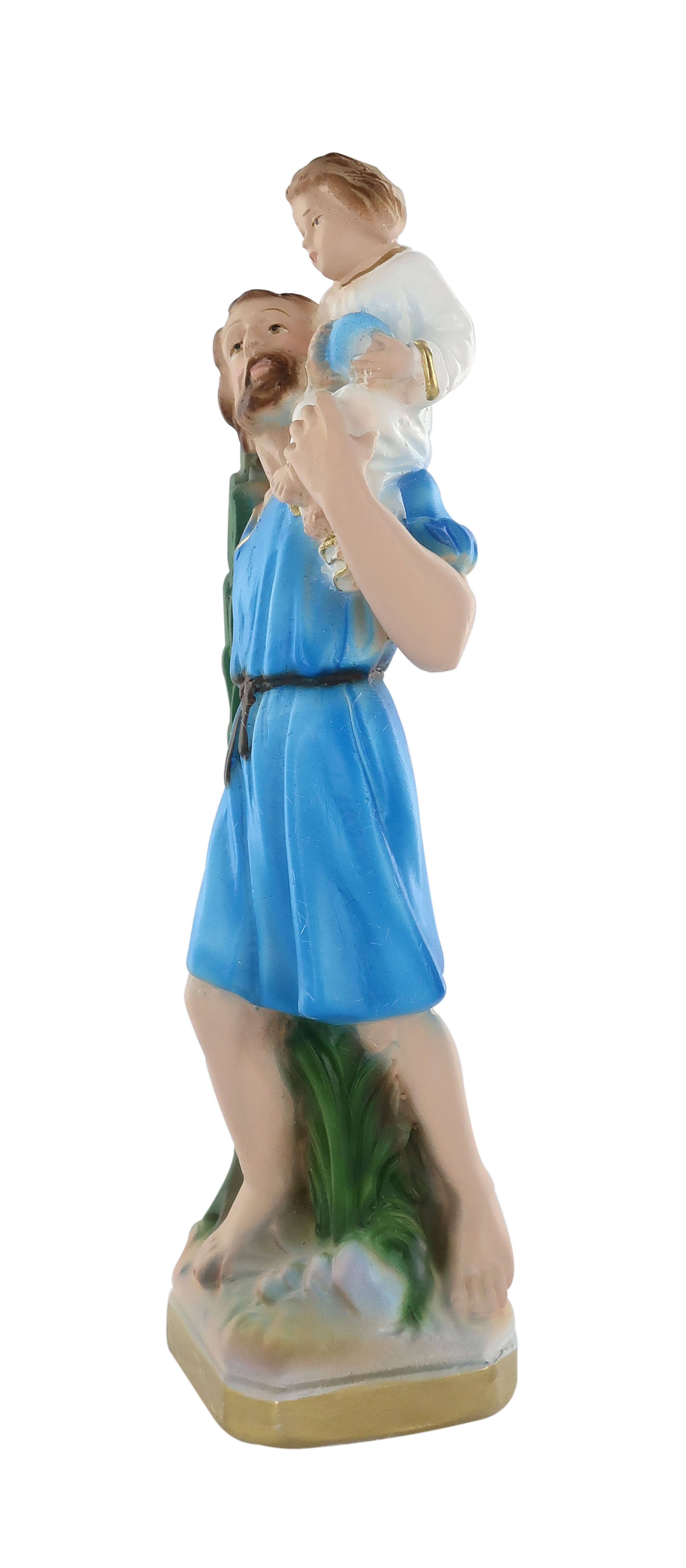La statua, in gesso finemente dipinto a mano, raffigura San Cristoforo, martire in Licia durante la persecuzione dell'imperatore Decio e patrono di viaggiatori, ferrovieri e automobilisti. Gli indumenti vantano un'attenzione particolare alla resa delle pieghe e delle delicate sfumature, che donano grande plasticità alla figura. Questa statua di San Cristoforo da 20 cm è realizzata artigianalmente in Italia e si distingue per la qualità della fattura e per il sapiente uso dei colori. Le linee delle vesti e la resa delle loro pieghe donano plasticità alla figura e la rendono suggestiva. Ideale per piccole nicchie in luoghi di culto, la statuetta di S. Cristoforo può anche essere esposta in casa come soprammobile o in una vetrinetta. Sarà particolarmente apprezzata come idea regalo dai devoti di questo personaggio. La luce delle fiammelle dei lumini o dei faretti esalterà la fisicità del soggetto, aumentandone l'impatto visivo. A causa della pittura a mano, la colorazione potrebbe variare: idealmente, ogni statua è un pezzo unico.