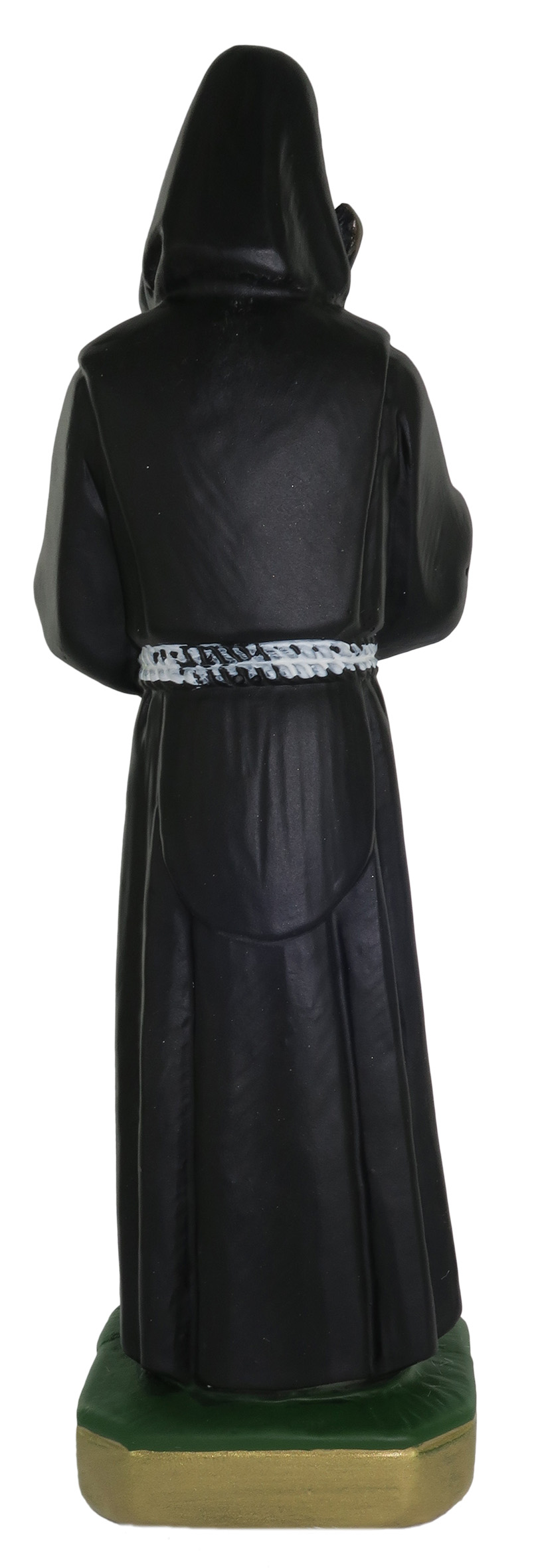 La statua, in gesso finemente dipinto a mano, raffigura San Francesco di Paola, eremita e fondatore dell'Ordine dei Minimi, su un piedistallo color oro e verde, con inciso il suo nome. Veste un saio nero con cappuccio e in mano tiene un bastone. Ben visibile, la barba lunga e il laccio che stringe l'indumento alla vita dell'uomo. Questa statua di S. Francesco di Paola da 23 cm è realizzata artigianalmente in Italia e si distingue per la qualità della fattura e per il sapiente uso dei colori. Gli indumenti, di un colore nero molto coprente, vantano un'attenzione particolare alla resa delle pieghe, che donano grande plasticità alla rappresentazione. La statua S. Francesco di Paola, proclamato santo da papa Leone X il 1° maggio 1519, è ideale per piccole nicchie e luoghi di culto, ma può anche essere esposta in casa come soprammobile o in una vetrinetta. Per i devoti a questo santo, sarà una bellissima idea regalo. La luce delle fiammelle dei lumini o dei faretti esalterà l'impatto visivo della figura. A causa della pittura a mano, la colorazione potrebbe variare: idealmente, ogni statua è un pezzo unico. Peso: 369 gr (389 gr con scatola). Dimensioni con confezione: 13 cm (L), 9 cm (A), 26 cm (P).