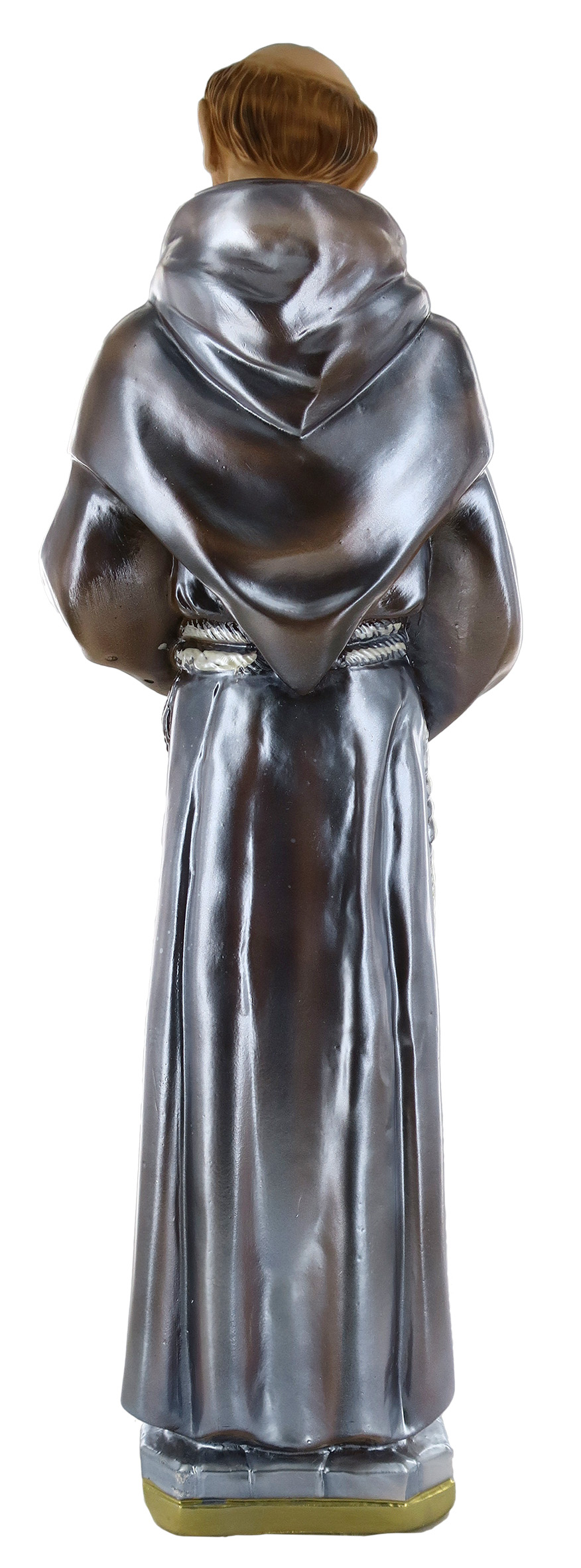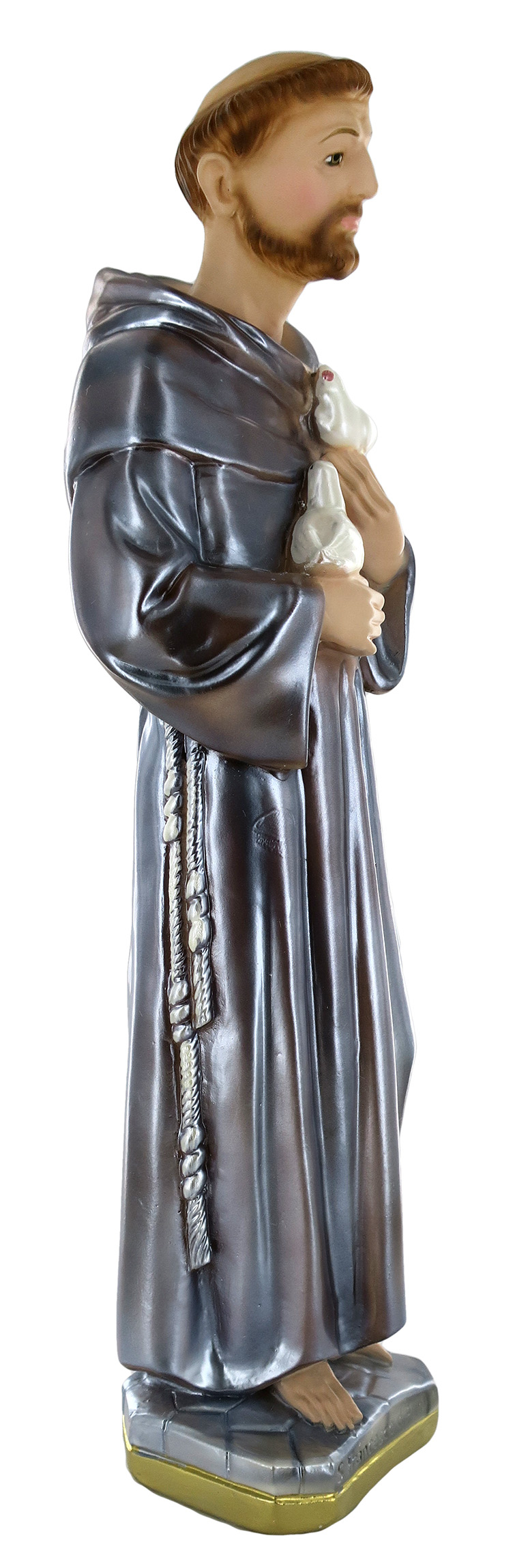 La statua, in gesso finemente dipinto a mano e impreziosito da una rifinitura madreperlata, raffigura San Francesco d'Assisi, una tra le figure più importanti della fede cristiana e grande esempio di sacrificio e fedeltà verso i principi cristiani. Su un piedistallo di color oro, indossa un saio stretto in vita da una cinta e divide la scena con due uccelli, simboleggianti la natura, dimensione verso la quale il santo ha sempre dimostrato e professato ammirazione. Dedicata all'autore de "Il Cantico delle Creature", questa statua di S. Francesco da 40 cm è realizzata artigianalmente in Italia e si distingue per la qualità della fattura e per il sapiente uso dei colori. L'effetto madreperlato rende le tinte molto lucenti e arricchisce la figura di suggestivi riflessi, donandole un aspetto elegante e raffinato. La statua di S. Francesco è ideale per piccole nicchie e luoghi di culto dedicati a colui che venne chiamato "il poverello di Assisi", dopo aver abbandonato le ricche vesti per fare voto di povertà e abbracciare appieno la parola del Signore. La luce delle fiammelle dei lumini o dei faretti esalterà l'effetto iridescente della sua rifinitura madreperlacea. A causa della pittura a mano, la colorazione potrebbe variare: idealmente, ogni statua è un pezzo unico. Peso: 1 kg e 626 gr (1 kg e 770 gr con scatola). Dimensioni: 12,5 cm (L), 40 cm (A), 8 cm (P). Confezione: 20 cm (L), 15 cm (A), 46 cm (P).