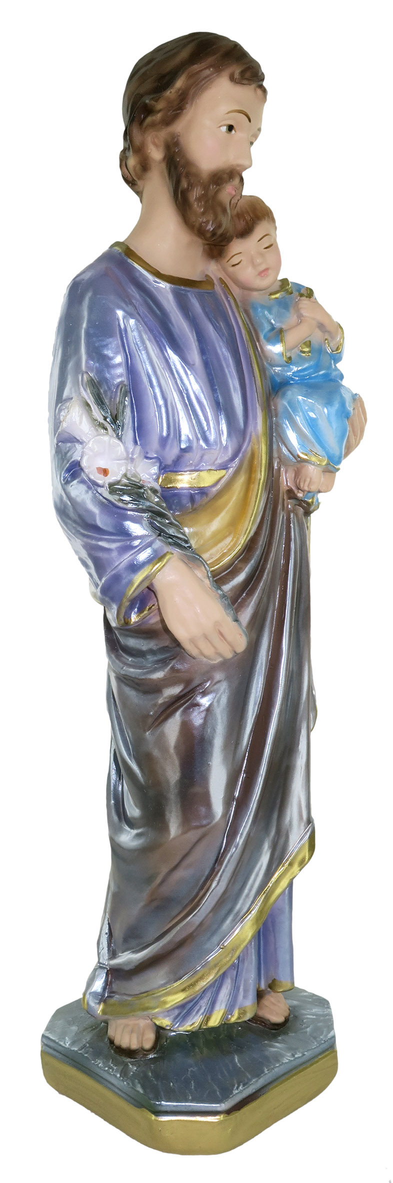 La statua, in gesso finemente dipinto a mano impreziosito da una rifinitura madreperlata, raffigura San Giuseppe, figura molto venerata da cattolici e ortodossi. Il padre putativo di Gesù considerato uomo "giusto" è rappresentato con il Bambino in braccio e un mazzo di fiori (i gigli di S. Giuseppe). I fiori emblema del santo sono conosciuti per la loro purezza e, per tale ragione, simboleggiano la castità dell'uomo. Gli indumenti vantano un'attenzione particolare alla resa delle pieghe e delle delicate sfumature, che donano grande plasticità alla figura. Questa statua di San Giuseppe da 30 cm è realizzata artigianalmente in Italia e si distingue per la qualità della fattura e per il sapiente uso dei colori. L'effetto madreperlato rende le tinte molto lucenti e arricchisce la figura di suggestivi riflessi, donandole un aspetto elegante e pregiato. La statua di S. Giuseppe è ideale per nicchie o luoghi di culto dedicati a San Giuseppe, ma può anche essere esposta in casa come soprammobile o in una vetrinetta. Sarà sicuramente un’idea regalo particolarmente apprezzata dai devoti a questo santo, dichiarato patrono della Chiesa cattolica dal beato Pio IX l'8 dicembre 1870. La luce delle fiammelle dei lumini o di faretti esalterà ulteriormente l'effetto iridescente della sua rifinitura madreperlacea. A causa della pittura a mano, la colorazione potrebbe variare e, idealmente, ogni statua è un pezzo unico.