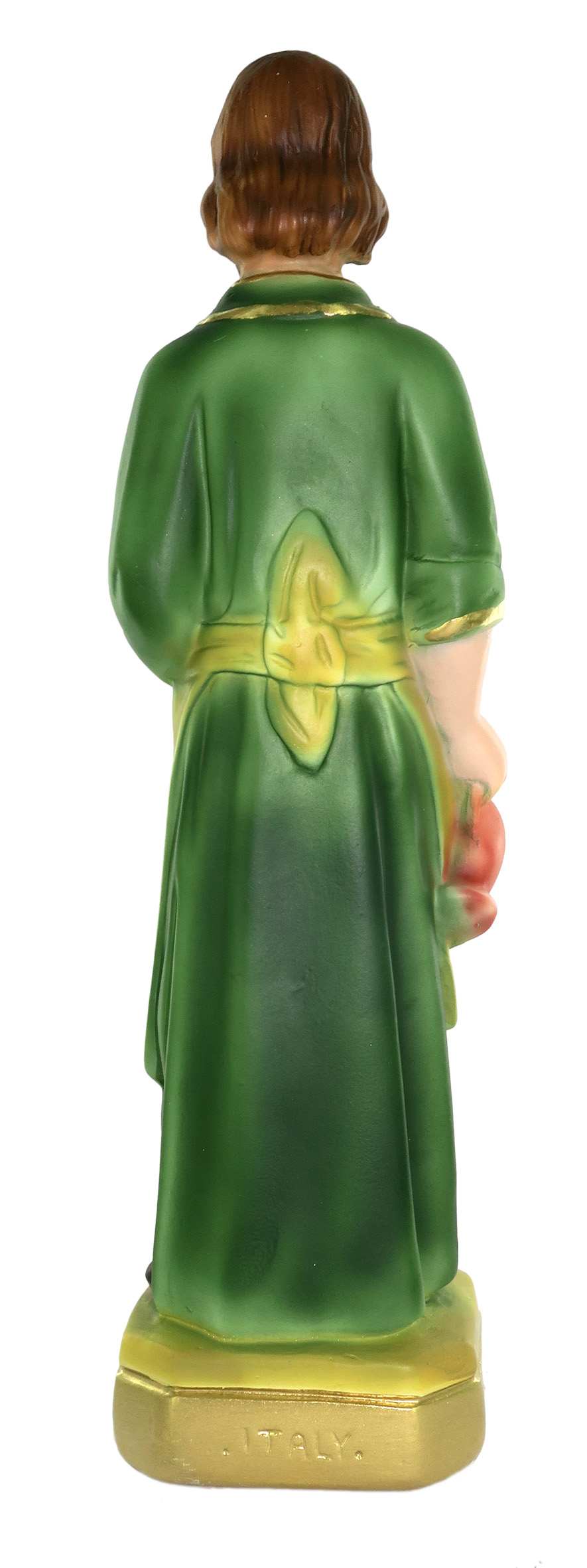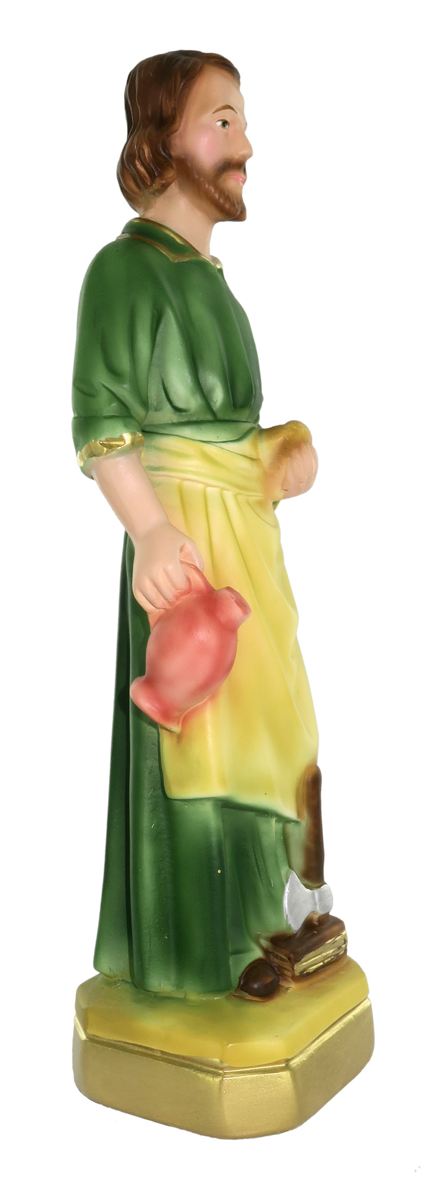 La statua, in gesso finemente dipinto a mano, raffigura San Giuseppe lavoratore, considerato simbolo delle attività produttive, della paternità e della dignità del lavoro. Il santo, ricordato il 1° maggio in relazione alla Festa dei Lavoratori, è patrono di padri, carpentieri e della classe lavoratrice. Qui rappresentato su un piedistallo color oro e verde, S. Giuseppe indossa un grembiule da lavoro giallo sopra a una veste verde, e tiene in mano acqua e pane, che simboleggiano il risultato del proprio lavoro e la sua capacità di provvedere al sostentamento della famiglia. Ai piedi, trova posto anche un'ascia, simbolo di operosità. Questa statua di San Giuseppe lavoratore da 20 cm è realizzata artigianalmente in Italia e si distingue per la qualità della sua fattura, il sapiente uso di colori sfumati e la resa accurata delle vesti. Tali caratteristiche contribuiscono a donare profondità e corpo al soggetto. Adatta anche a piccole nicchie in luoghi di culto, la statuetta di S. Giuseppe può inoltre essere esposta in casa come soprammobile o in una vetrinetta e sarà una gradita idea regalo per i suoi devoti. Lumini o faretti esalteranno la tridimensionalità del personaggio e ne aumenteranno l'impatto visivo. A causa della pittura a mano, la colorazione potrebbe variare: idealmente, ogni statua è un pezzo unico.