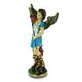 La statua, in gesso finemente dipinto a mano, raffigura San Michele, Arcangelo e Principe delle milizie celesti. Lo stesso titolo di Arcangelo è stato attribuito a S. Gabriele e a S. Raffaele. La sua funzione è quella di difesa della fede in Dio contro le orde di Lucifero (diventato Satana), da cui Michele si è distaccato dopo la scissione degli Angeli da Dio. Il soggetto alato, che impugna la propria lancia, è qui rappresentato con un mantello rosso, un'armatura color argento e ali color oro, intento a calpestare il male, rappresentato da una creatura oscura prossima a ricevere il suo fendente fatale. Questa statua di San Michele Arcangelo da 40 cm è realizzata artigianalmente in Italia e si distingue per la qualità della fattura e per il sapiente uso dei colori. Le tonalità cromatiche usate donano plasticità alla figura, celebrata il 29 settembre. La statua è ideale per nicchie e luoghi di culto. La luce delle fiammelle dei lumini o dei faretti esalterà la fisicità del soggetto, aumentandone l'impatto visivo. A causa della pittura a mano, la colorazione potrebbe variare: idealmente, ogni statua è un pezzo unico.