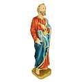 La statua, in gesso finemente dipinto a mano, raffigura San Pietro, primo Papa della Chiesa cattolica e primo vescovo di Roma. Celebrato il 29 giugno, è qui rappresentato su un piedistallo e, come vuole l'iconografia, tiene in mano le chiavi, simbolo del suo ruolo nel Regno dei Cieli. Nella rappresentazione spicca il contrasto cromatico delle vesti, azzurre e arancioni, abbellite da un bordo di color oro. Questa statua di S. Pietro da circa 20 cm è realizzata artigianalmente in Italia e si distingue per la qualità della sua fattura, il sapiente uso di colori sfumati e la resa accurata delle linee delle vesti. Tali caratteristiche contribuiscono a donare profondità e corpo al soggetto. Adatta anche a piccole nicchie in luoghi di culto, può inoltre essere esposta in casa come soprammobile o in una vetrinetta. La piccola statua di San Pietro è una gradita idea regalo per i suoi devoti. Lumini o faretti esalteranno la tridimensionalità del personaggio e ne aumenteranno l'impatto visivo. A causa della pittura a mano, la colorazione potrebbe variare: idealmente, ogni statua è un pezzo unico. Peso: 343 gr (363 gr con scatola). Dimensioni: 7,5 cm (L), 22 cm (A), 5,5 cm (P). Imballaggio: 11 cm (L), 9 cm (A), 25 cm (P).