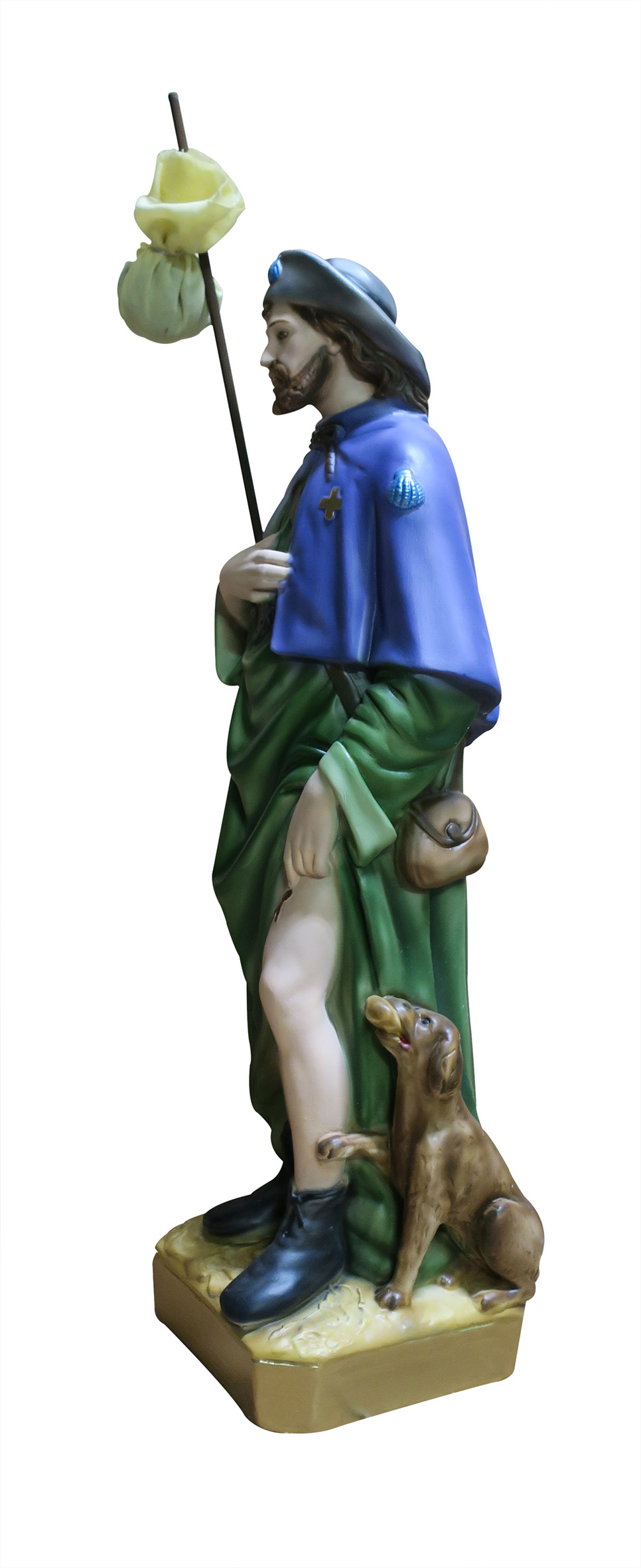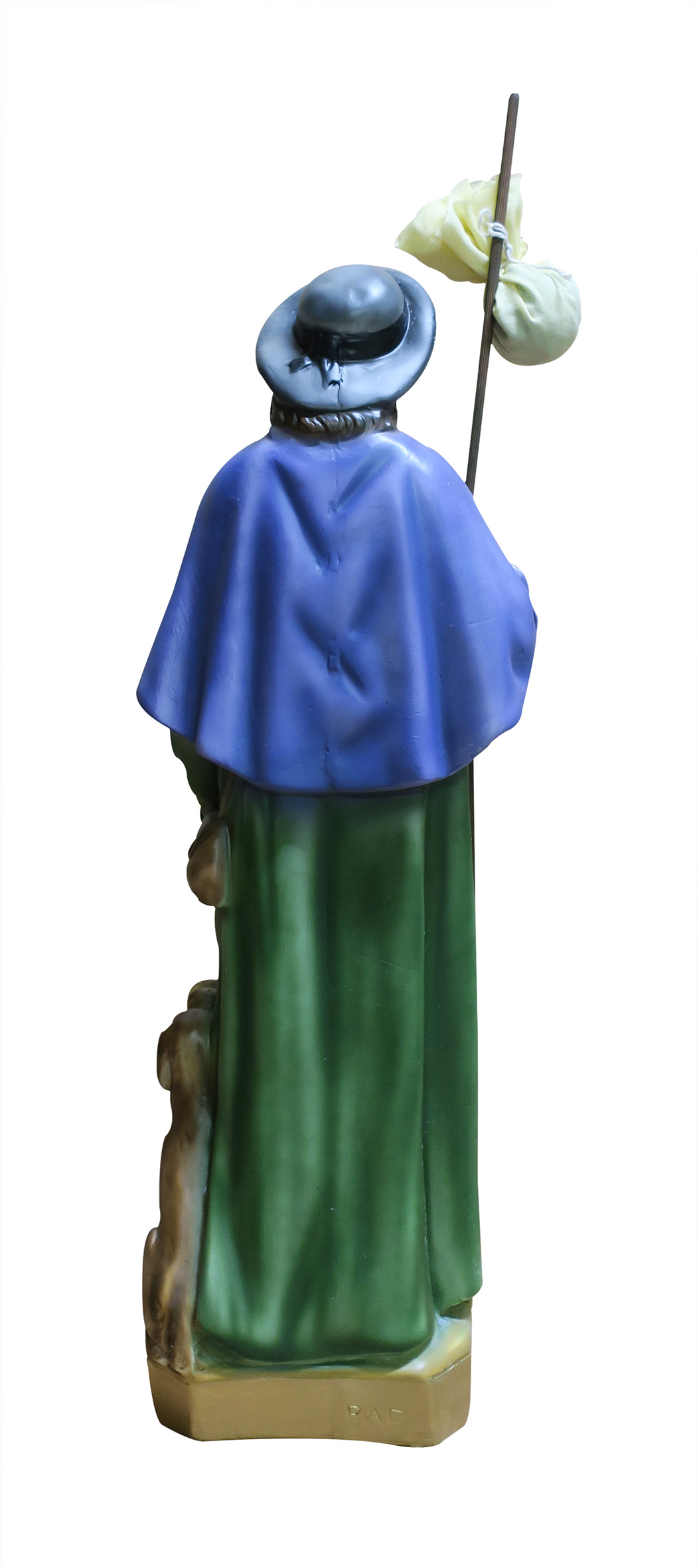La grande statua, in gesso finemente dipinto a mano, raffigura San Rocco, pellegrino, terziario francescano e taumaturgo. Diventato conosciuto nella comunità cristiana per le sue opere di assistenza ai malati di peste durante il suo peregrinare verso Roma, viene spesso invocato come protettore contro le calamità naturali e le malattie degli animali. Il santo, ricordato il 16 agosto, è patrono di malati infettivi, invalidi e prigionieri. Qui rappresentato su un piedistallo color oro e giallo, S. Rocco regge un bastone da viandante, indossa un grembiule verde e condivide la scena con alcuni dei simboli che lo identificano: il cane e l'emblema del pellegrino sul suo coprispalle. Il santo mostra anche una piaga sulla gamba, che ricorda la malattia che, durante la sua devota vita, si è dedicato a debellare nelle persone che incontrava lungo il suo percorso. La statua, per risultare ancora più realistica, include il fagotto da viandante in stoffa, da attaccare al caratteristico bastone in simil-legno. Questa statua di San Rocco da circa 60 cm d'altezza è realizzata artigianalmente in Italia e si distingue per la qualità della sua fattura, il sapiente uso di colori sfumati e la resa accurata delle vesti. Tali caratteristiche contribuiscono a donare profondità e corpo al soggetto. Adatta a grandi nicchie in luoghi di culto e a edicole, la statua di S. Rocco sarà ancora più scenografica se illuminata da faretti, che esalteranno la tridimensionalità del personaggio e ne aumenteranno l'impatto visivo. A causa della pittura a mano, la colorazione potrebbe variare: idealmente, ogni statua è un pezzo unico. Peso: 8,95 kg (9,9 kg con scatola). Dimensioni: 22 cm (L), 61 cm (A), 18 cm (P). Imballo: 29 cm (L), 23 cm (A), 70,5 cm (P).