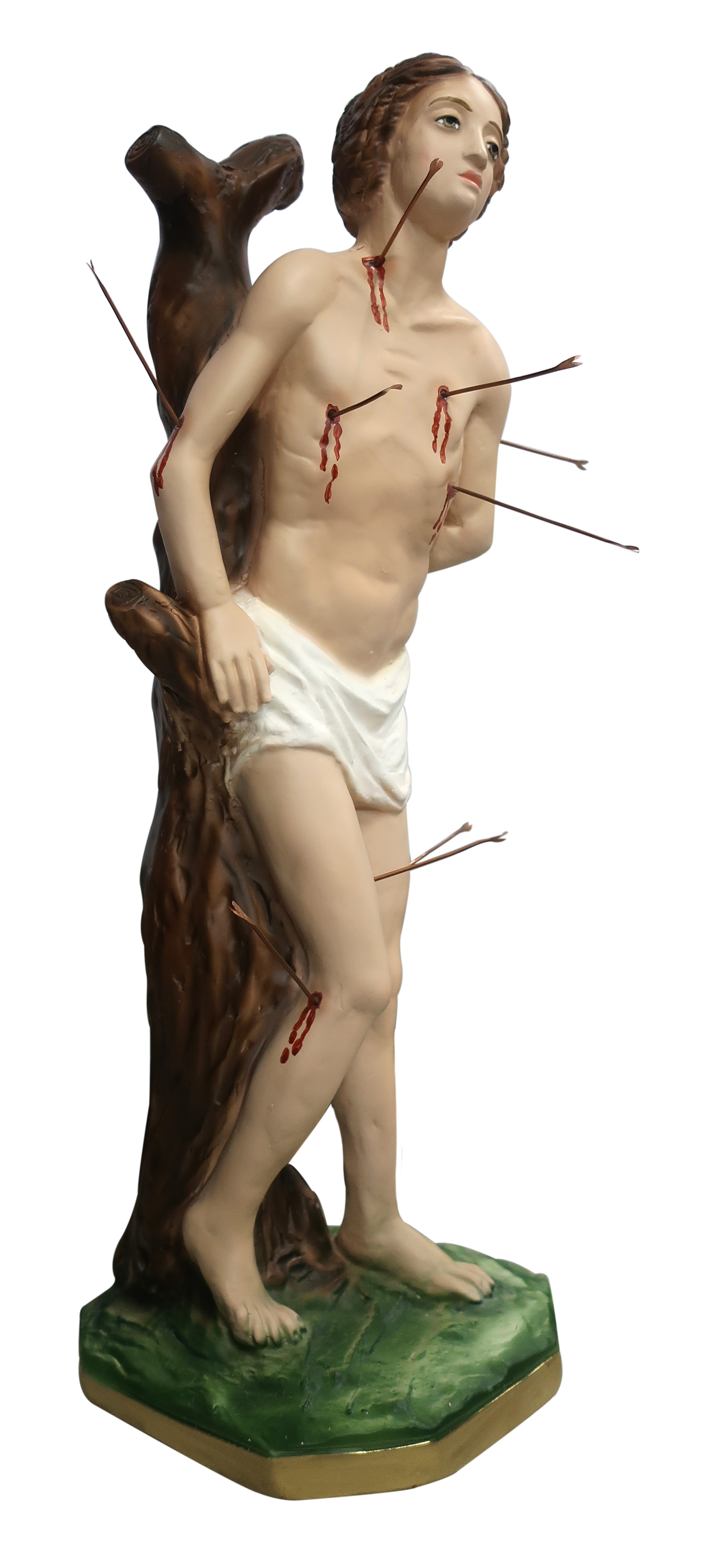 La statua, in gesso finemente dipinto a mano, raffigura San Sebastiano, prima militare romano e poi martire a causa del suo sostegno alla fede cristiana, celebrato il 20 gennaio. È rappresentato come da iconografia: legato ad un tronco, con un drappo bianco intorno alla vita, frecce (simbolo del beato) color argento che gli trafiggono le carni e ferite sanguinolente. È il patrono di arcieri, tappezzieri, polizia locale e della città di Gallipoli. Questa statua di San Sebastiano da 40 cm è realizzata artigianalmente in Italia e si distingue per la qualità della fattura e per il sapiente uso dei colori. Le linee delle vesti e la resa delle loro pieghe donano plasticità alla figura e la rendono suggestiva. Particolarmente adatta a nicchie di luoghi di culto, la statua di S. Sebastiano risulta ancora più bella se illuminata dalla luce delle fiammelle dei lumini o dei faretti, che esalterà la fisicità del soggetto e ne aumenterà l'impatto visivo. A causa della pittura a mano, la colorazione potrebbe variare: idealmente, ogni statua è un pezzo unico. Dimensioni: 14,5 cm (L), 40 cm (A), 15 cm (P). Peso: 2,2 kg.