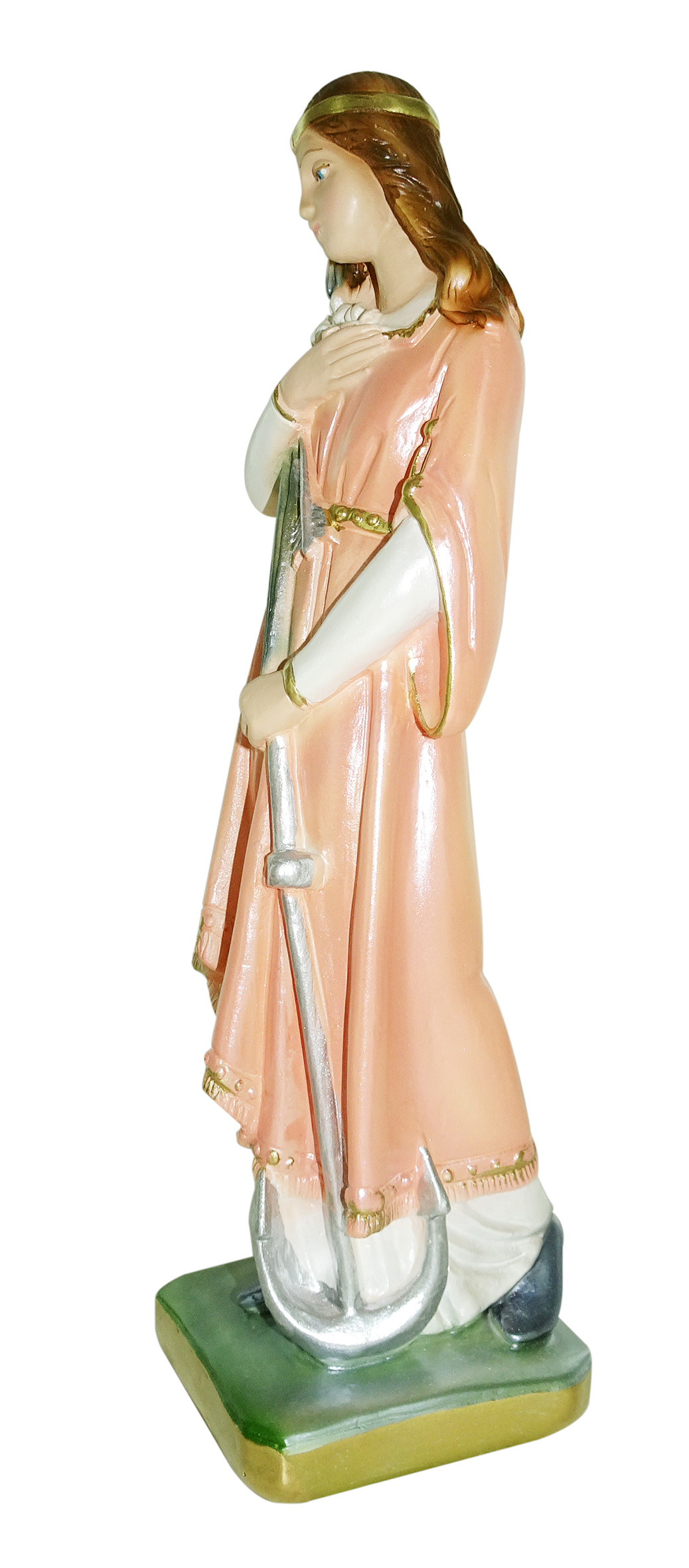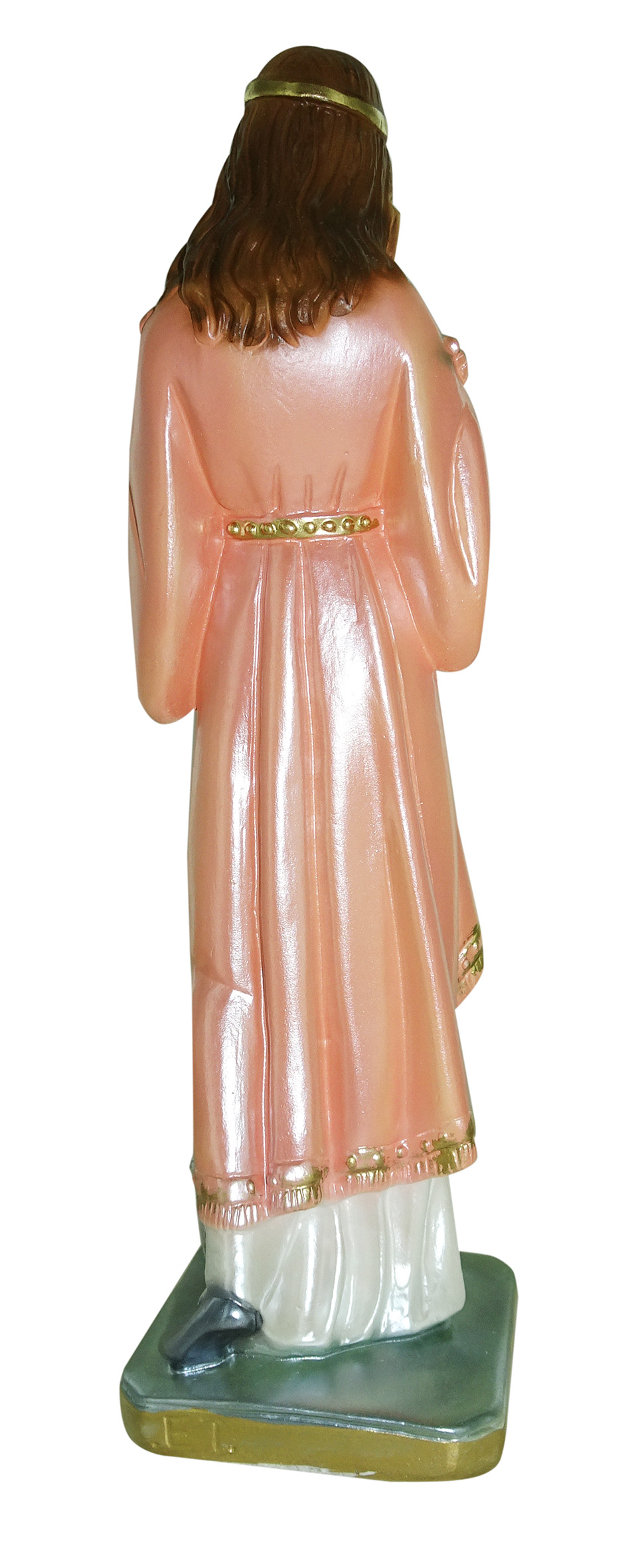 La statua, in gesso finemente dipinto a mano e impreziosito da una rifinitura madreperlata, raffigura Santa Filomena, principessa, vergine e martire celebrata l'11 agosto. Ambita dall'Imperatore romano Diocleziano, che le offrì di diventare sua moglie e imperatrice, venne da lui perseguitata a seguito del suo rifiuto, motivato dalla sua totale fedeltà al Signore. Morì per decapitazione. La statua a lei dedicata include anche il suo simbolo, la foglia di palma. Questa statua di S. Filomena da circa 20 cm d'altezza è realizzata artigianalmente in Italia e si distingue per la qualità della fattura e per il sapiente uso dei colori. L'effetto madreperlato rende le tinte molto lucenti e arricchisce la figura di suggestivi riflessi, donandole un aspetto elegante e raffinato. Da esporre in piccole nicchie di luoghi di culto, la statuetta di Santa Filomena è ideale da esporre in vetrinette di casa o come soprammobile. Sarà, inoltre, una gradita idea regalo per i devoti a questo personaggio. La luce delle fiammelle dei lumini o dei faretti esalterà l'effetto iridescente della sua rifinitura madreperlacea, rendendo la figura ancora più bella. A causa della pittura a mano, la colorazione potrebbe variare: idealmente, ogni statua è un pezzo unico. Peso: 296 gr. Dimensioni: 6 cm (L), 22 cm (A), 6 cm (P).