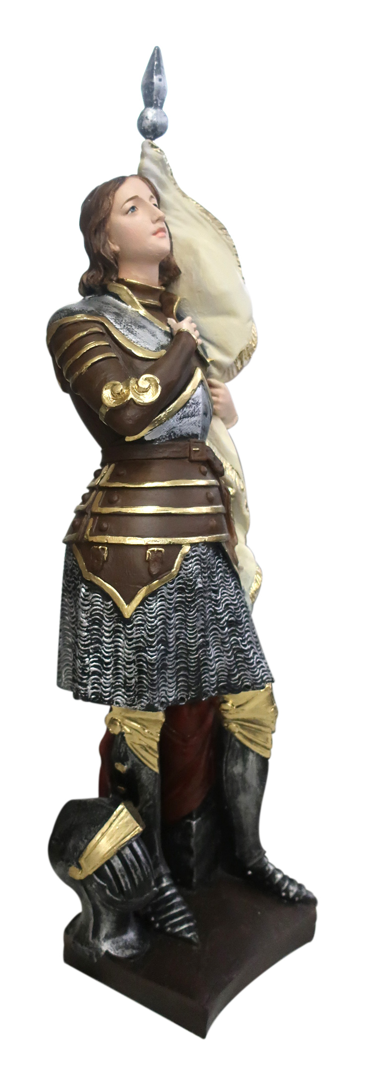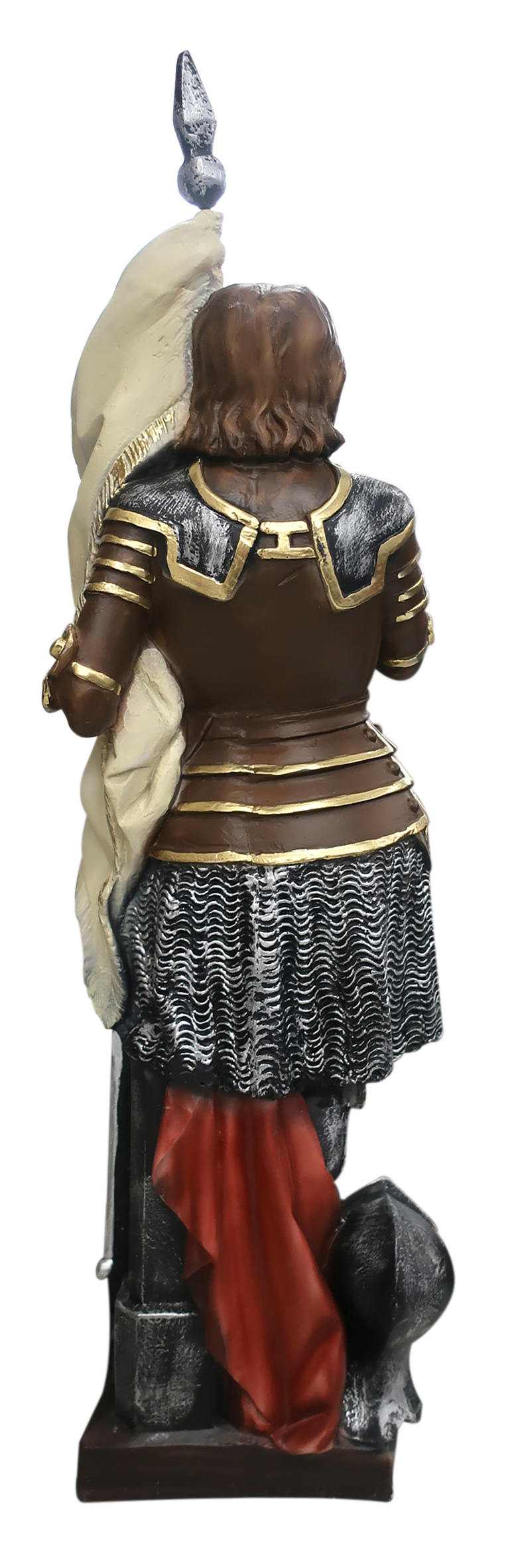 La statua, in resina finemente dipinta a mano, raffigura Santa Giovanna d'Arco, personaggio di origini molto semplici, distintosi per coraggio e ardore cristiano. Proclamata santa da Benedetto XV nel 1920, in gioventù seguì voci misteriose, secondo cui le fu attribuita la missione di liberare il suo Paese, la Francia, dagli Inglesi. Senza appoggi da parte del re, fu prima catturata, per poi essere condannata e arsa viva per eresia. Suo simbolo è la spada. Questa statua di S. Giovanna d'Arco da 45 cm è realizzata artigianalmente in Italia e si distingue per la qualità della fattura e per il sapiente uso dei colori. Le tonalità cromatiche impiegate donano plasticità alla figura, che vanta uno stile classico. La statua di Santa Giovanna d'Arco, viste le sue dimensioni, è ideale per nicchie, cappellette votive e luoghi di culto. La luce di faretti esalterà la fisicità del soggetto, aumentandone l'impatto visivo. A causa della pittura a mano, la colorazione potrebbe variare: idealmente, ogni statua è un pezzo unico. Dimensioni: 13 cm (L), 45 cm (A), 9,5 cm (P). Peso: 3,846 kg.