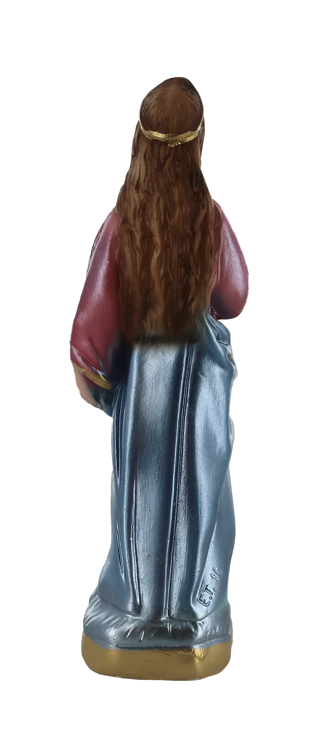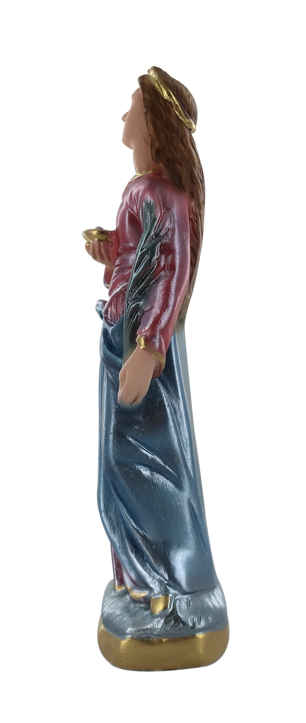 La statua, in gesso finemente dipinto a mano e impreziosito da una rifinitura madreperlata, raffigura Santa Lucia, vergine e martire durante le persecuzioni di Diocleziano. Patrona di Siracusa, degli elettricisti, dei non vedenti e degli oculisti, è celebrata il 13 dicembre. I suoi indumenti vantano un'attenzione particolare alla resa delle pieghe e delle delicate sfumature, che donano grande plasticità e profondità alla rappresentazione. Questa statua di S. Lucia da 15 cm è realizzata artigianalmente in Italia e si distingue per la qualità della fattura e per il sapiente uso dei colori, adeguatamente dosati. L'effetto madreperlato rende le tinte molto lucenti e arricchisce la figura di suggestivi riflessi, donandole un aspetto elegante e pregevole. Adatta anche a piccole nicchie di ambienti dedicati al culto, la statuetta di Santa Lucia è ideale per essere esposta in casa come soprammobile o in una vetrinetta. Sarà una gradita idea regalo per i devoti a questa figura. La luce delle fiammelle dei lumini o dei faretti esalterà l'effetto iridescente della sua rifinitura madreperlacea. A causa della pittura a mano, la colorazione potrebbe variare: idealmente, ogni statua è un pezzo unico.