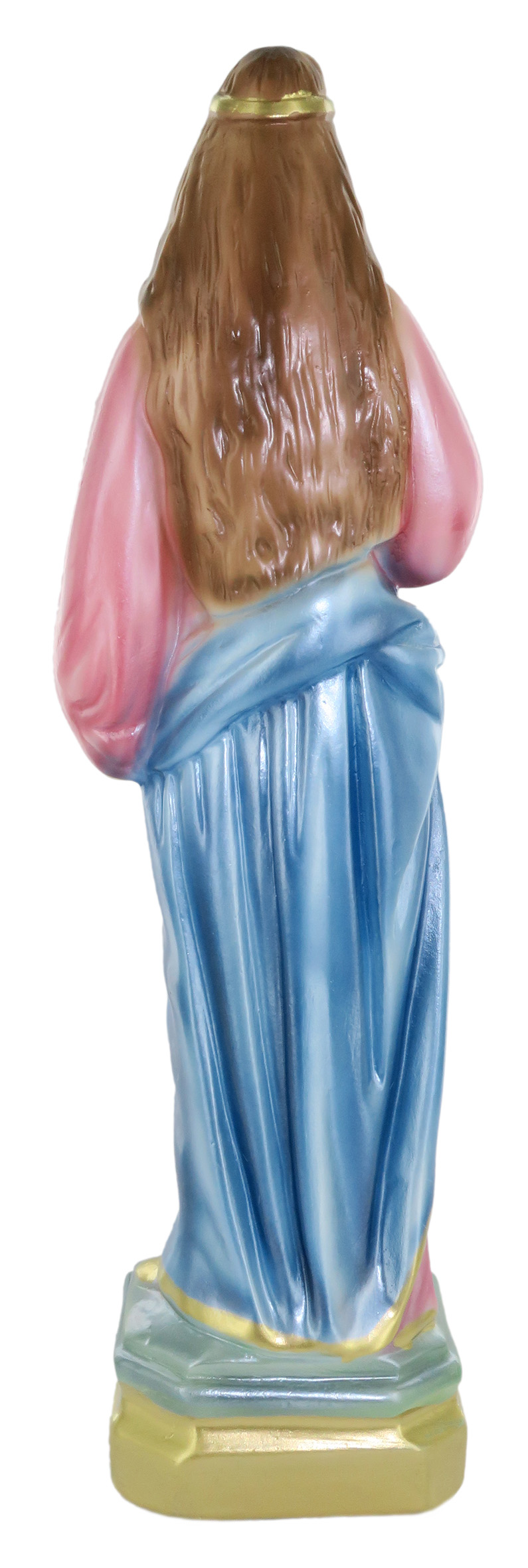 La statua, in gesso finemente dipinto a mano e impreziosito da una rifinitura madreperlata, raffigura Santa Lucia, vergine e martire durante le persecuzioni di Diocleziano. Patrona di Siracusa, degli elettricisti, dei non vedenti e degli oculisti, è celebrata il 13 dicembre. Viene qui rappresentata in vesti rosa e azzurre con bordi color oro, mentre tiene in mano due dei suoi simboli: una foglia di palma e una coppa che contiene due occhi. I suoi indumenti vantano un'attenzione particolare alla resa delle pieghe e delle delicate sfumature, che donano grande plasticità e profondità alla rappresentazione. Questa statua di S. Lucia da 30 cm è realizzata artigianalmente in Italia e si distingue per la qualità della fattura e per il sapiente uso dei colori, adeguatamente dosati. L'effetto madreperlato rende le tinte molto lucenti e arricchisce la figura di suggestivi riflessi, donandole un aspetto elegante e pregevole. Adatta anche a nicchie di ambienti dedicati al culto, la statua di Santa Lucia è ideale per essere esposta in casa come soprammobile o in una vetrinetta. Sarà una gradita idea regalo per i devoti a questa figura. La luce delle fiammelle dei lumini o dei faretti esalterà l'effetto iridescente della sua rifinitura madreperlacea. A causa della pittura a mano, la colorazione potrebbe variare: idealmente, ogni statua è un pezzo unico.