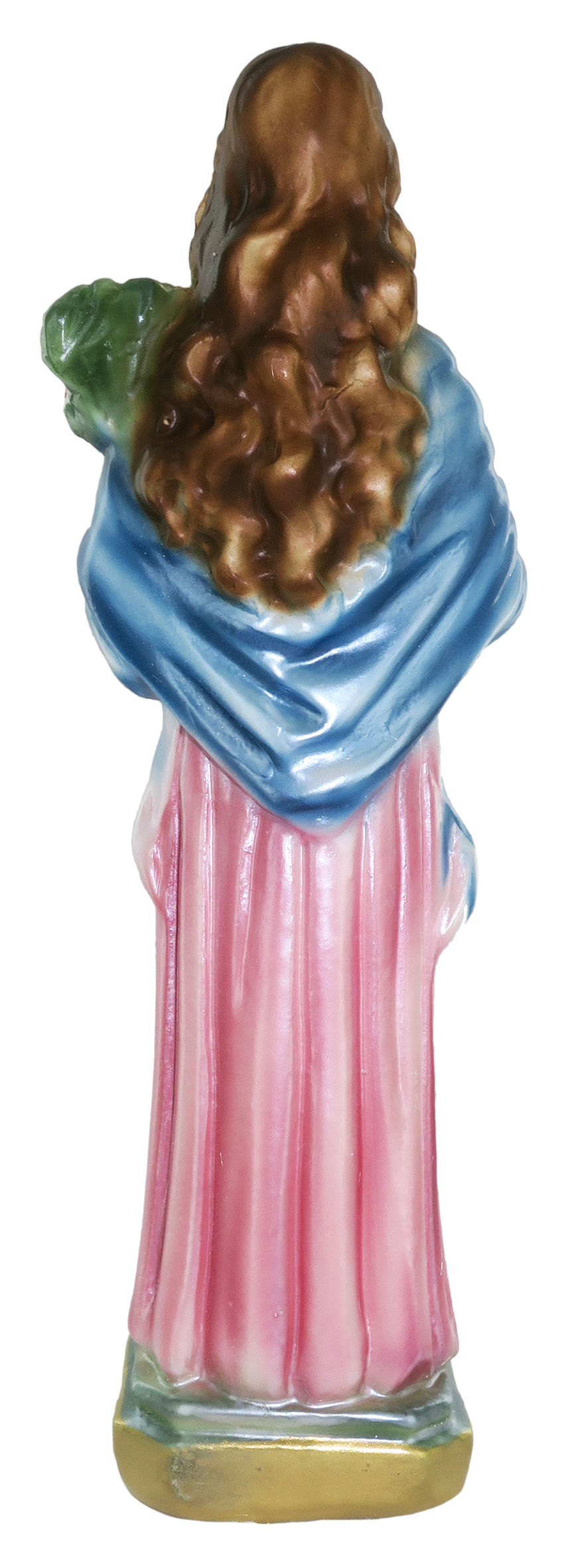 La statua, in gesso finemente dipinto a mano e impreziosito da una rifinitura madreperlata, raffigura Santa Maria Goretti, vergine e martire assassinata all'età di 11 anni. Giurata la verginità e la propria fedeltà alla fede, Maria incontrò la morte per mano di un violentatore che la pugnalò ripetutamente a causa del suo rifiuto. Maria Goretti fu proclamata santa nel 1950. Rappresentata in questa statua con il suo simbolo, la palma, Maria indossa vesti rosa e un coprispalle azzurro. Questa statua di S. Maria Goretti da 20 cm d'altezza è realizzata artigianalmente in Italia e si distingue per la qualità della fattura e per il sapiente uso dei colori. L'effetto madreperlato rende le tinte molto lucenti e arricchisce la figura di suggestivi riflessi, donandole un aspetto elegante e raffinato. Da esporre in piccole nicchie di luoghi di culto, la statuetta di Santa Maria Goretti è ideale da esporre in vetrinette di casa o come soprammobile. Sarà, inoltre, una gradita idea regalo per i devoti a questo personaggio, santa patrona delle vittime di crimini e violenze. La luce delle fiammelle dei lumini o dei faretti esalterà l'effetto iridescente della sua rifinitura madreperlacea, rendendo la figura ancora più bella. A causa della pittura a mano, la colorazione potrebbe variare: idealmente, ogni statua è un pezzo unico. Peso: 276 gr. Dimensioni: 6 cm (L), 20 cm (A), 6 cm (P).