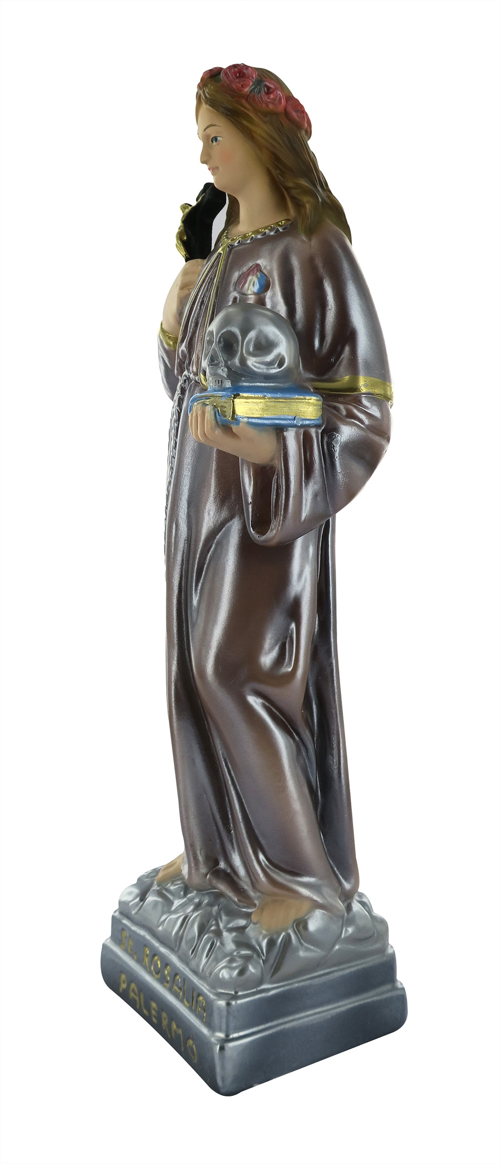Statua da 30 cm di Santa Rosalia realizzata in gesso madrerlato e finemente dipinta a mano da un artigiano italiano.Prodotta in Italia.