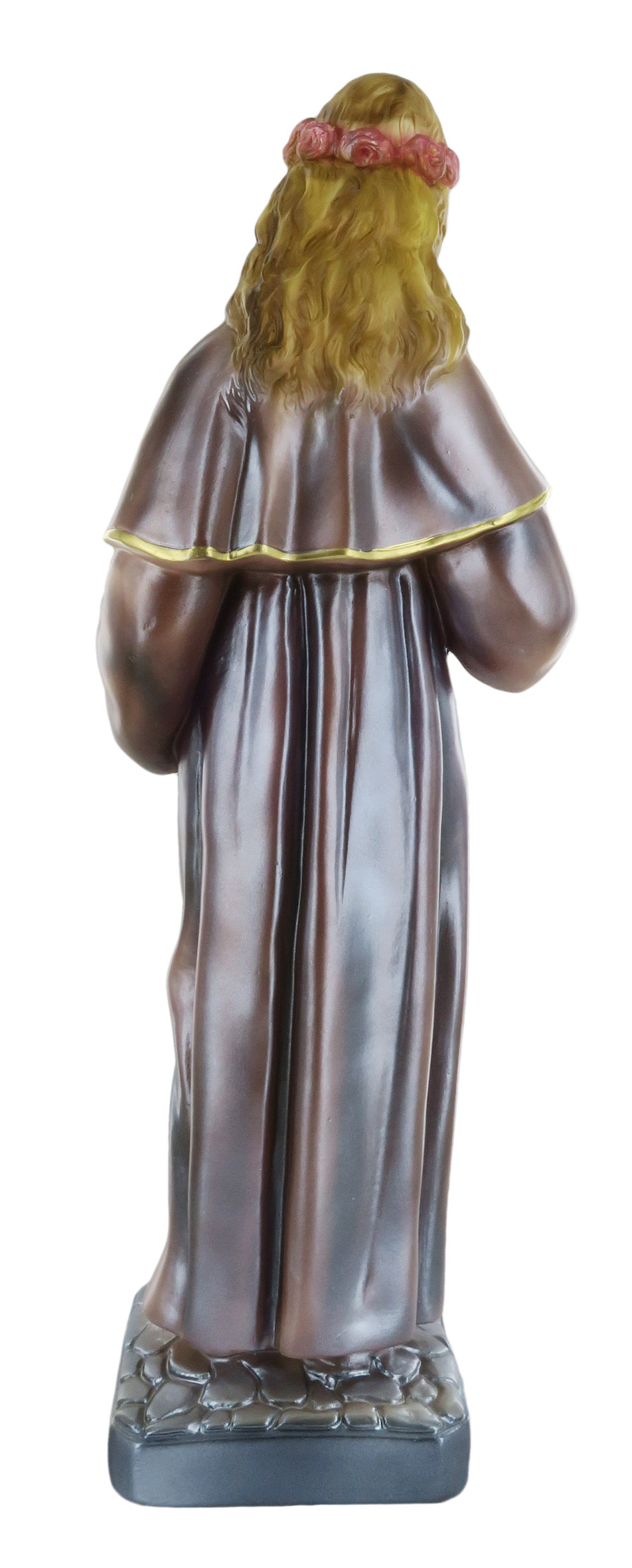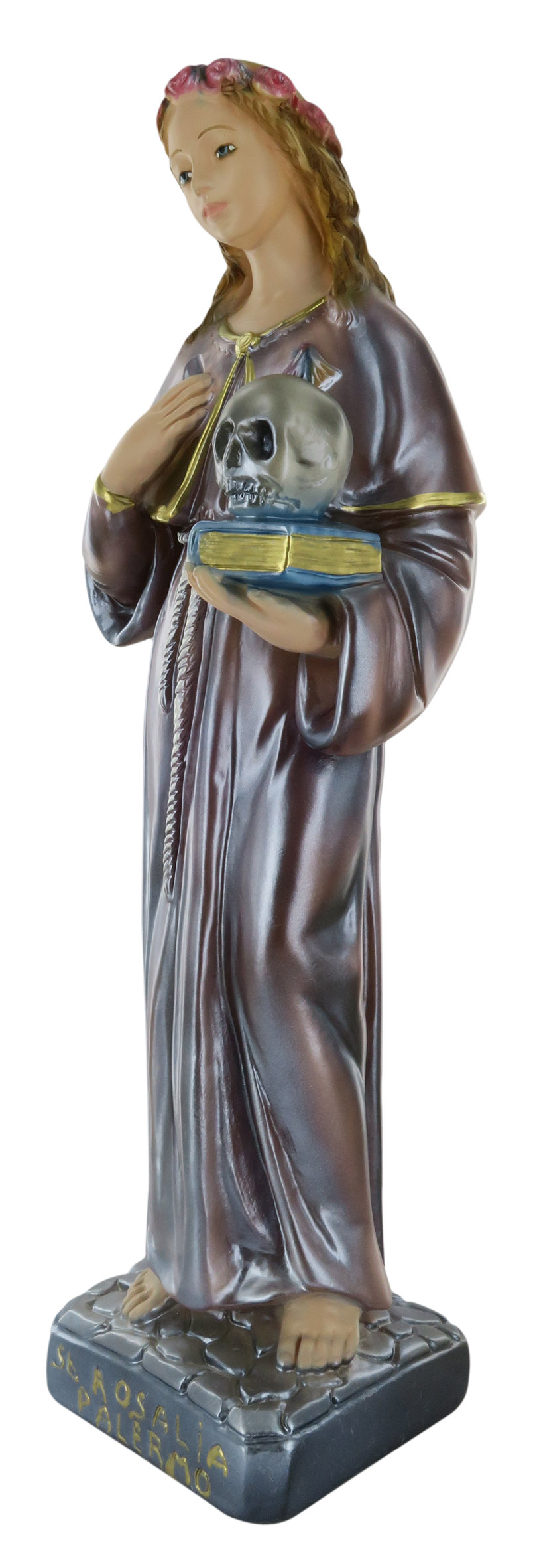 La statua, in gesso finemente dipinto a mano e impreziosita da una rifinitura madreperlata, raffigura Santa Rosalia, santa vergine eremita siciliana del XII secolo conosciuta anche come "La Santuzza". In questa rappresentazione, indossa una veste grigia, dal colore quasi metallico e molto ricca di pieghe, mentre con l'altra regge un libro e un teschio, suo simbolo. Fa parte della simbologia a lei ricondotta anche la corona di rose, da lei indossata in questa statua. È su un piedistallo che reca la scritta "St. Rosalia Palermo". Infatti, è la santa patrona della sua città natale. Questa statua di Santa Rosalia da 40 cm è realizzata artigianalmente in Italia e si distingue per la qualità della fattura e per il sapiente uso dei colori, adeguatamente dosati. L'effetto madreperlato rende le tinte molto lucenti e arricchisce la figura di suggestivi riflessi, donandole un aspetto elegante e pregevole. La statua di S. Rosalia è adatta a nicchie in ambienti dedicati al culto e sarà ancora più bella se illuminata dalla luce delle fiammelle dei lumini o dei faretti, che esalterà l'effetto iridescente della sua rifinitura madreperlacea. A causa della pittura a mano, la colorazione potrebbe variare: idealmente, ogni statua è un pezzo unico. Peso: 1,6 kg (1,741 kg con scatola). Dimensioni: 13,5 cm (L), 40 cm (A), 9 cm (P). Confezione: 20 cm (L), 14.5 cm (A), 46 cm (P).