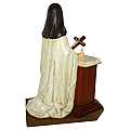 La statuetta, in resina finemente dipinta a mano, raffigura Santa Teresa d'Ávila col volto verso l'alto, appoggiata a uno scrittoio intenta a scrivere con una mano e a reggere il crocifisso con l'altra. In questa rappresentazione, la carmelitana indossa gli abiti religiosi nei casti colori del bianco e del marrone, mostrando soltanto il volto e le mani.La cura dei dettagli e la maestria nella colorazione delle vesti e delle rifiniture rendono questa piccola statua di Santa Teresa d'Ávila una gradita idea regalo. Peso: 502 gr. Dimensioni: 14,5 cm (L), 21 cm (A), 9 cm (P).