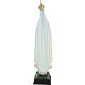 Questa statuetta della Vergine di Fatima di circa 15 cm d'altezza è prodotta a Fatima, in Portogallo, è realizzata in poliestere ed è dipinta a mano. Il volto della Vergine è molto delicato e la donna ha le mani conserte, in segno di preghiera. I suoi abiti sono abbelliti da bordi in color oro, ricche di pieghe e sfumature molto tenui di color giallo e azzurro. Sul capo, la Vergine di Fatima porta una corona metallica di color oro che contribuisce a far risaltare ulteriormente il suo volto. Lungo il vestito, si nota il rosario di color argento, ben realizzato, elemento classico di questa raffigurazione mariana. La nuvola su cui poggia vanta sfumature molto delicate di color rosa. Viste le sue dimensioni contenute, la statuetta può essere impiegata come soprammobile o esser esposta in una vetrinetta a casa. Può anche essere una gradita idea regalo per i devoti mariani. Peso: 34 gr. Dimensioni (con corona): 4 cm (L), 15,5 cm (A), 3,4 cm (P).