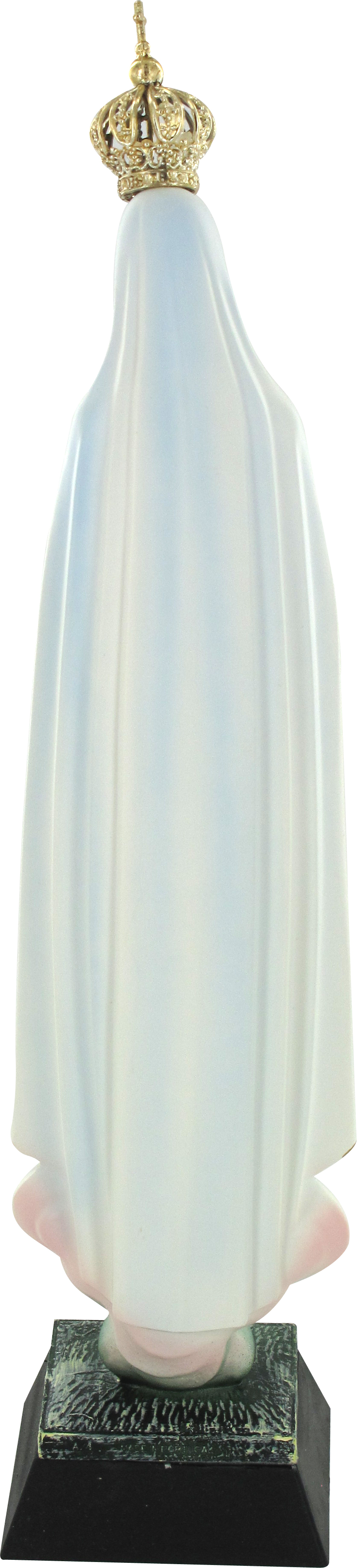 Questa statua della Vergine di Fatima di circa 27 cm d'altezza è prodotta a Fatima, in Portogallo, è realizzata in poliestere ed è dipinta a mano. Il volto della Vergine è molto delicato e la donna ha le mani conserte, in segno di preghiera. I suoi abiti sono abbelliti da bordi in color oro, ricche di pieghe e sfumature molto tenui di color giallo e azzurro. Sul capo, la Vergine di Fatima porta una corona metallica di color oro che contribuisce a far risaltare ulteriormente il suo volto. Lungo il vestito, si nota il rosario di color argento, ben realizzato, elemento classico di questa raffigurazione mariana. La nuvola su cui poggia vanta sfumature molto delicate di color rosa. Viste le sue dimensioni, la statua può essere impiegata in piccole nicchie di luoghi di culto, come soprammobile o esser esposta in una vetrinetta a casa. Può anche essere una gradita idea regalo per i devoti mariani. Peso: 312 gr. Dimensioni (con corona): 7 cm (L), 30 cm (A), 5,5 cm (P).