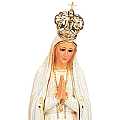 Questa statua della Vergine di Fatima di circa 35 cm d'altezza è prodotta a Fatima, in Portogallo, è realizzata in poliestere ed è dipinta a mano. Il volto della Vergine, qui rappresentata con le mani giunte in preghiera, è molto delicato e vanta occhi marroni di cristallo. Il loro aspetto è molto realistico e curato.Gli abiti, abbelliti da strass arancioni, bordi e decori in color oro, sono ricchi di pieghe e sfumature molto tenui di color giallo e azzurro. Sul capo, la Vergine di Fatima porta una corona metallica di color oro che contribuisce a far risaltare ulteriormente il suo volto. Lungo il vestito, si nota il rosario di color argento, ben realizzato, elemento classico di questa raffigurazione mariana. La nuvola su cui poggia vanta sfumature molto delicate di color rosa. Viste le sue dimensioni, la statua della Madonna di Fatima è particolarmente adatta a nicchie di luoghi di culto. Peso: 698 gr. Dimensioni (con corona): 9,5 cm (L), 39 cm (A), 7,7 cm (P).