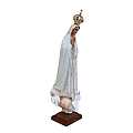 Questa grande statua della Vergine di Fatima di circa 85 cm d'altezza è prodotta a Fatima, in Portogallo, è realizzata in poliestere ed è dipinta a mano. Il volto della Vergine, qui rappresentata con le mani giunte in preghiera, è molto delicato e vanta occhi marroni di cristallo. Il loro aspetto è molto realistico e curato. Gli abiti, abbelliti da strass multicolore, bordi e decori in color oro, sono ricchi di pieghe e sfumature molto tenui di color giallo e azzurro. Sul capo, la Vergine di Fatima porta una corona metallica di color oro, anch'essa impreziosita da strass di svariati colori, che contribuisce a far risaltare ulteriormente il suo volto. Questa statua da 85cm d'altezza non ha colombe sul basamento. Viste le sue dimensioni importanti, la statua della Madonna di Fatima è particolarmente adatta a grandi nicchie in luoghi di culto, edicole e cappellette. Peso: 4,85 kg. Dimensioni (con corona): 33 cm (L), 93 cm (A), 20 cm (P).