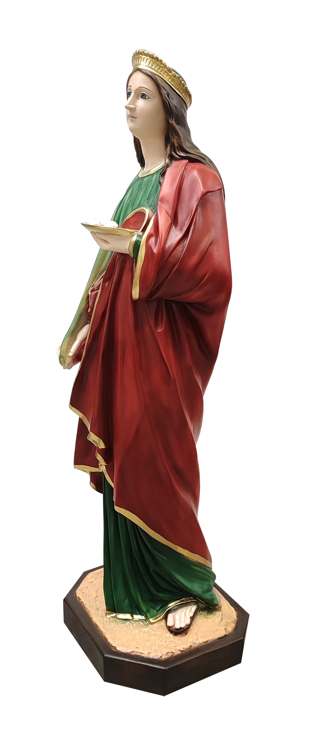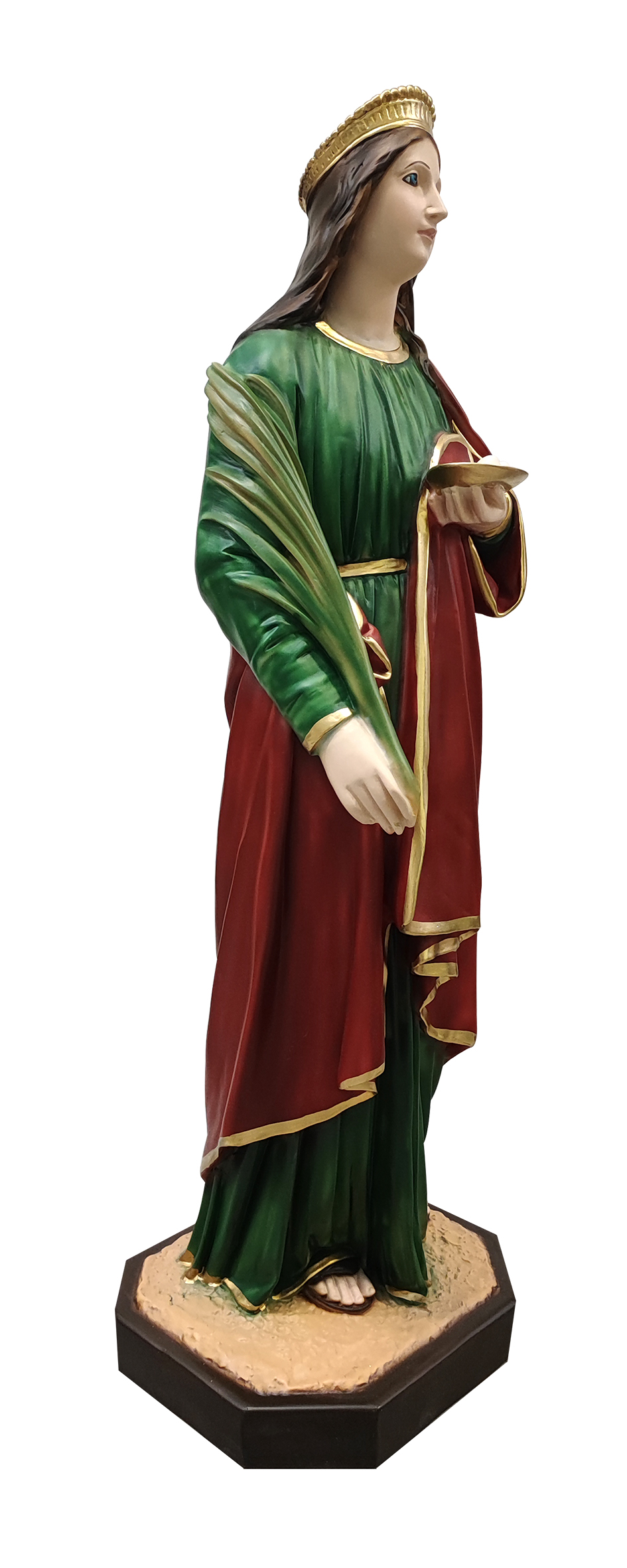 La grande statua, in resina finemente dipinta a mano, raffigura Santa Lucia, vergine e martire durante le persecuzioni di Diocleziano. Patrona di Siracusa, degli elettricisti, dei non vedenti e degli oculisti, è celebrata il 13 dicembre. I suoi indumenti vantano un'attenzione particolare alla resa delle pieghe, che donano grande plasticità e profondità alla rappresentazione. Questa statua di S. Lucia da 90 cm è realizzata artigianalmente in Italia e si distingue per la qualità della fattura e per il sapiente uso dei colori. Adatta a grandi nicchie, ampi ambienti dedicati al culto, cappellette e edicole votive, la grande statua di Santa Lucia risulterà ancora più bella se illuminata da faretti, che esalteranno la tridimensionalità e l'impatto visivo del soggetto. A causa della pittura a mano, la colorazione potrebbe variare: idealmente, ogni statua è un pezzo unico.
