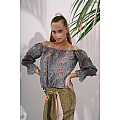 Blusa in voile di cotone; fantasia “Jakarta”; scollo elastico a “barchetta”; fondo maniche a sbuffo, coulisse in vita con lacci di chiusura scorrevoli e nappine sui finali. Taglia II / M-L / IT 42-44 / US 8-10 / UK 10-12. Composizione: 100% CO (Cotone). Nato con l'intento di rompere gli schemi stilistici in fatto di beachwear, vantando uno stile non convenzionale volto a esaltare una femminilità audace e scanzonata, il brand "Amorissimo" vuole portare colore e ironia nel mondo dei costumi da donna. La scelta di tessuti e di accessori di pregio sono parte del DNA del brand. Ogni costume Amorissimo è "100% Hand-Made in Italy with Love".