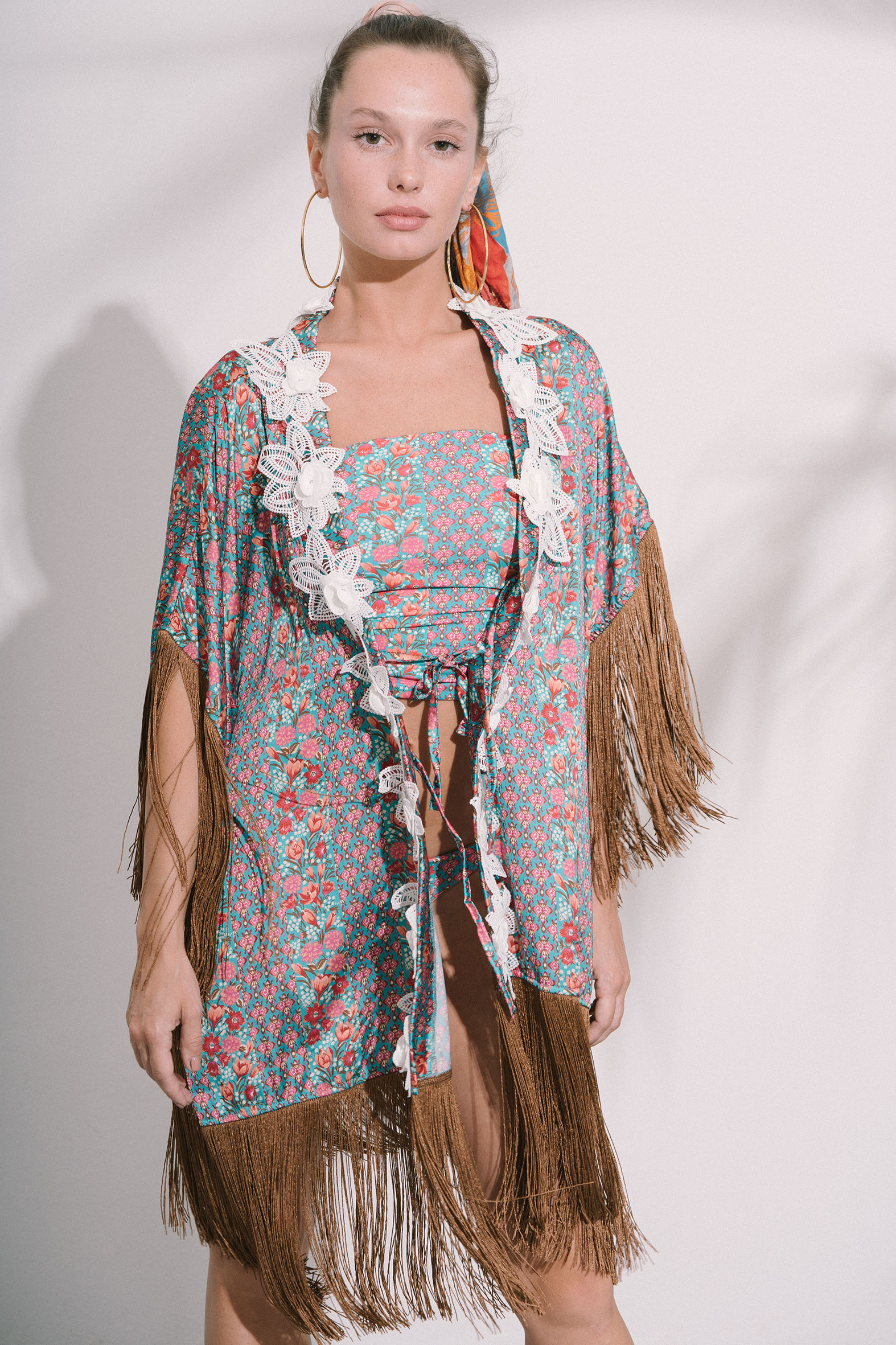Kimono in raso, fantasia “Jakarta”; lunga frangia su maniche e finale abito; lacci di chiusura interni, bordatura con raffinato nastro macramé floreale. Taglia III / L-XL / IT 44-46 / US 10-12 / UK 12-14. Composizione: 100% PL (Poliestere). Nato con l'intento di rompere gli schemi stilistici in fatto di beachwear, vantando uno stile non convenzionale volto a esaltare una femminilità audace e scanzonata, il brand "Amorissimo" vuole portare colore e ironia nel mondo dei costumi da donna. La scelta di tessuti e di accessori di pregio sono parte del DNA del brand. Ogni costume Amorissimo è "100% Hand-Made in Italy with Love".