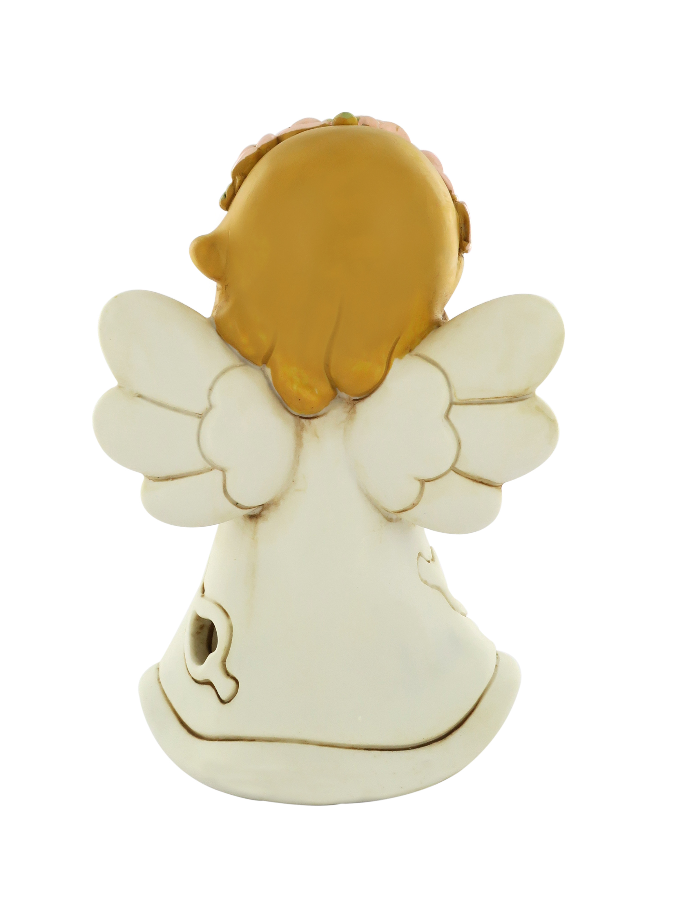 L'angelo che prega con luce, molto adatto per bambini, è una statuina di resina dipinta vuota al suo interno, che ospita una luce LED alimentata da batterie tipo AG3 (spesso usate negli orologi). Le vesti dell'angelo hanno dei fori a forma di cuore, da cui esce la luce prodotta dalla lampadina al suo interno. Il dolce angelo indossa una veste color crema, dagli orli rosa, e ha le mani conserte in segno di preghiera. Sul volto beato, con gote sfumate, si notano i capelli biondi mossi, adornati da una corona di fiori rosa. L'uso di colori abbastanza coprenti e opachi dona alla statuina un aspetto molto simile all'argilla. La statuina emette una luce molto fioca e delicata, particolarmente adatta al comodino della cameretta dei bambini. Le batterie vanno inserite nell'apposito alloggiamento alla base della statuina.Dimensioni: 10 cm (L), 15 cm (A), 8,5 cm (P). Peso: 243 gr.