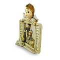 Il piccolo quadretto in resina beige rappresenta un angioletto sopra a una finestra aperta. All'interno, è raffigurata la Sacra Famiglia: Giuseppe e Maria, il primo con una mano sul petto e la seconda a mani giunte, stanno ammirando Gesù Bambino nella culla. Visto il soggetto della Natività, è una decorazione natalizia molto carina, particolarmente adatta a bambini. Il piccolo soprammobile è adatto ad essere appoggiato su superfici, anche di piccole dimensioni, considerata la sua lunghezza di soli 8 cm e la base d'appoggio di 1,5 cm. Ideale per scrivanie, non è adatto a essere appeso, può essere una valida alternativa al presepe. Lo stesso soggetto è disponibile anche in bianco (effettuare una ricerca con la barra sopra, inserendovi il codice 2020NA).Dimensioni: 8 cm (L), 7,5 cm (A), 1,8 cm (P). Peso: 37 gr.