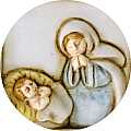 Il piccolo quadretto in resina beige rappresenta un angioletto sopra a una finestra aperta. All'interno, sono raffigurati la Madonna con le mani conserte in segno di preghiera e il Bambino nella culla. Il piccolo soprammobile è adatto ad essere appoggiato su superfici, anche di piccole dimensioni, considerata la sua lunghezza di soli 8 cm e la base d'appoggio di 1,5 cm. Ideale per scrivanie, non è adatto a essere appeso. Dimensioni: 8 cm (L), 7,5 cm (A), 1,5 cm (P). Peso: 33 gr.