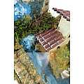 Accessori per presepe: Cascata rapida con corso che si sdoppia. Decorato con casetta e ponticello, oltre a dettagli in sughero e muschio che ricreano elementi naturali del paesaggio. Dimensioni: 35 x 16 x 22 cm. Materiali: Legno, sughero e muschio. Realizzato artigianalmente in Italia.